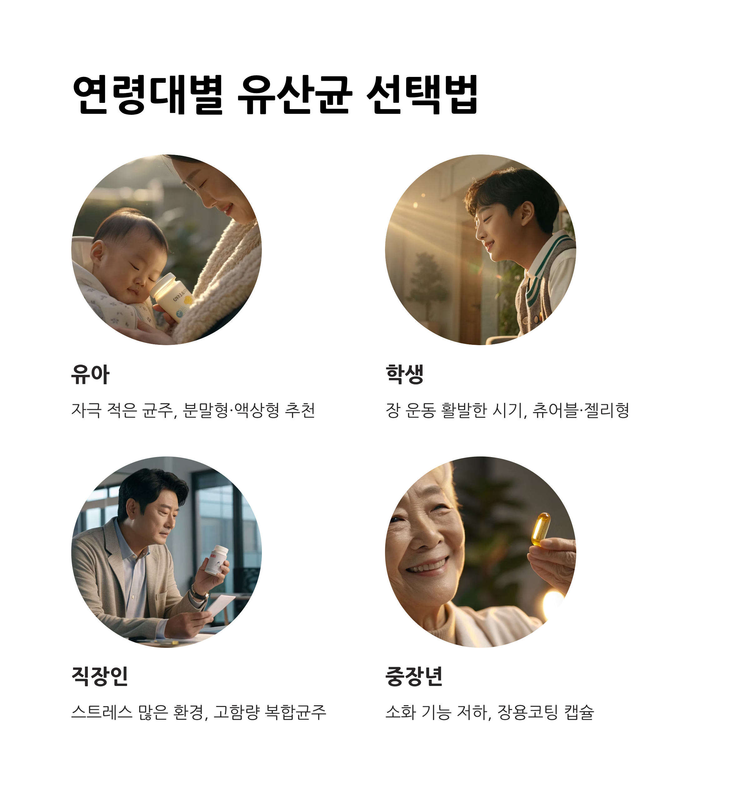 | 유아 | 자극 적은 균주, 알레르기 유발 주의 | 분말형, 액상형 |