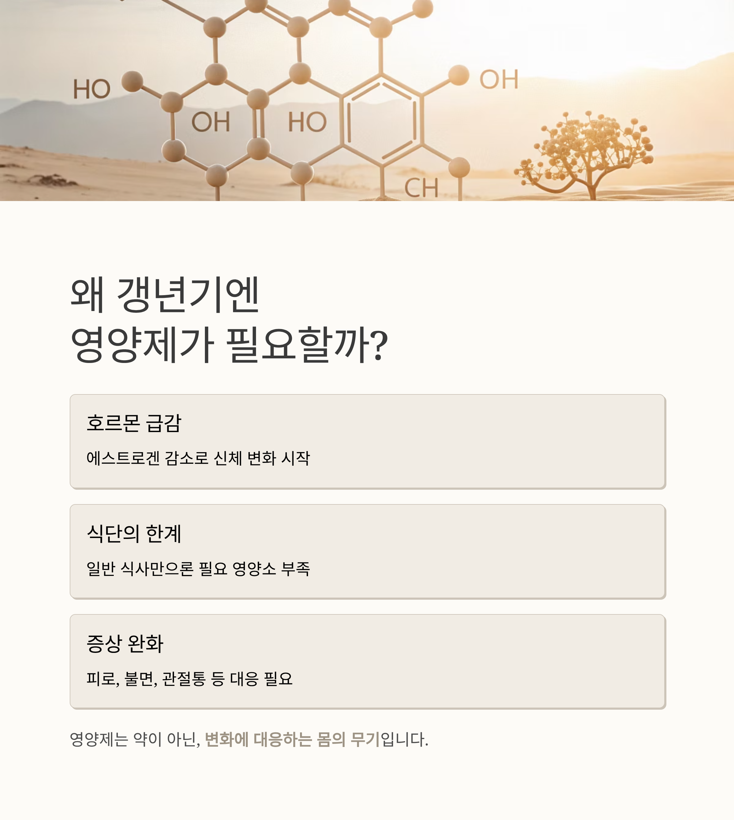 갱년기 관리에서 중요한 건 단일 성분이 아니라 균형 잡힌 조합입니다.