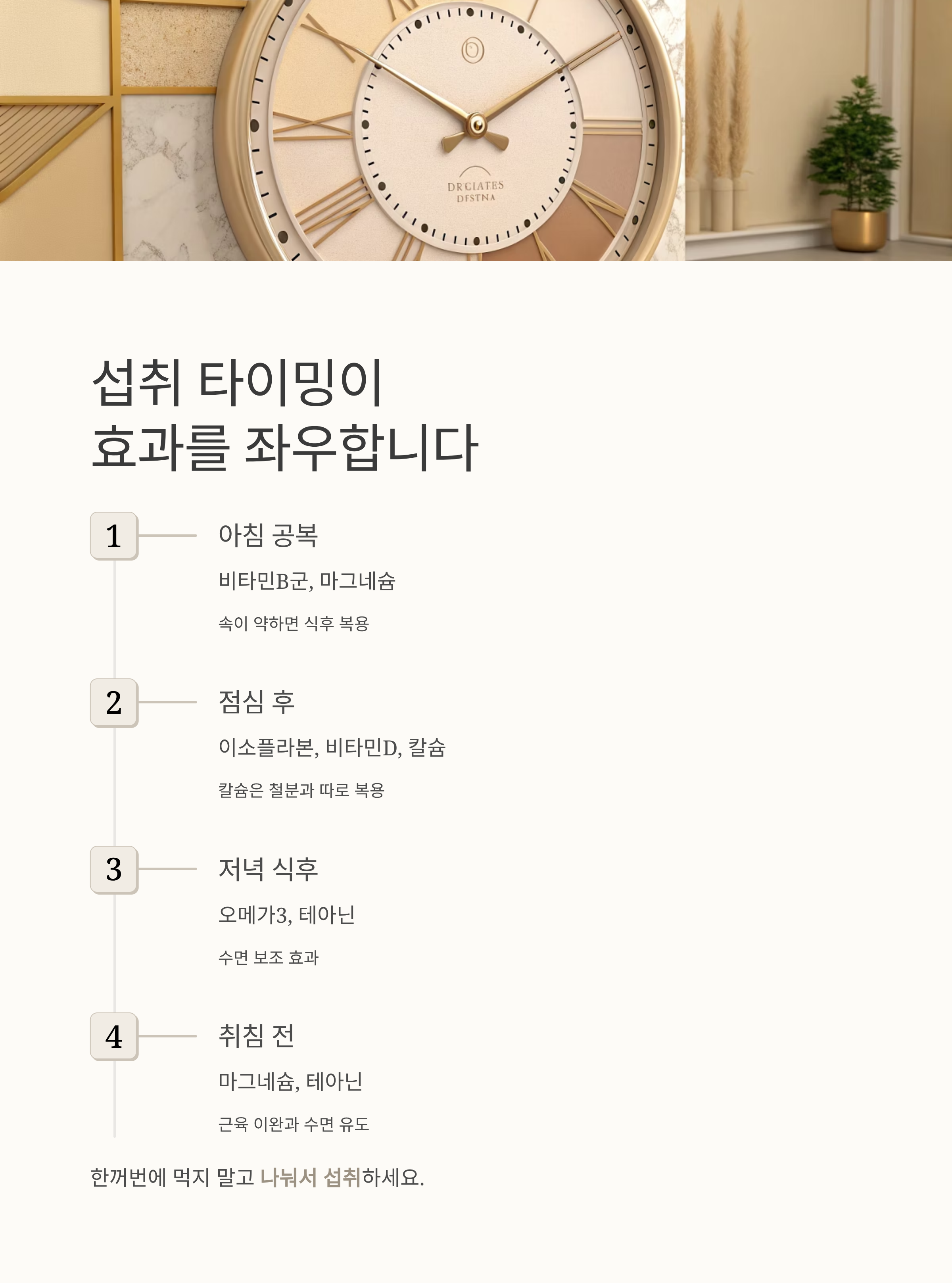 | 아침 공복 | 비타민B군, 마그네슘 | 속이 약한 경우 식후 복용 |