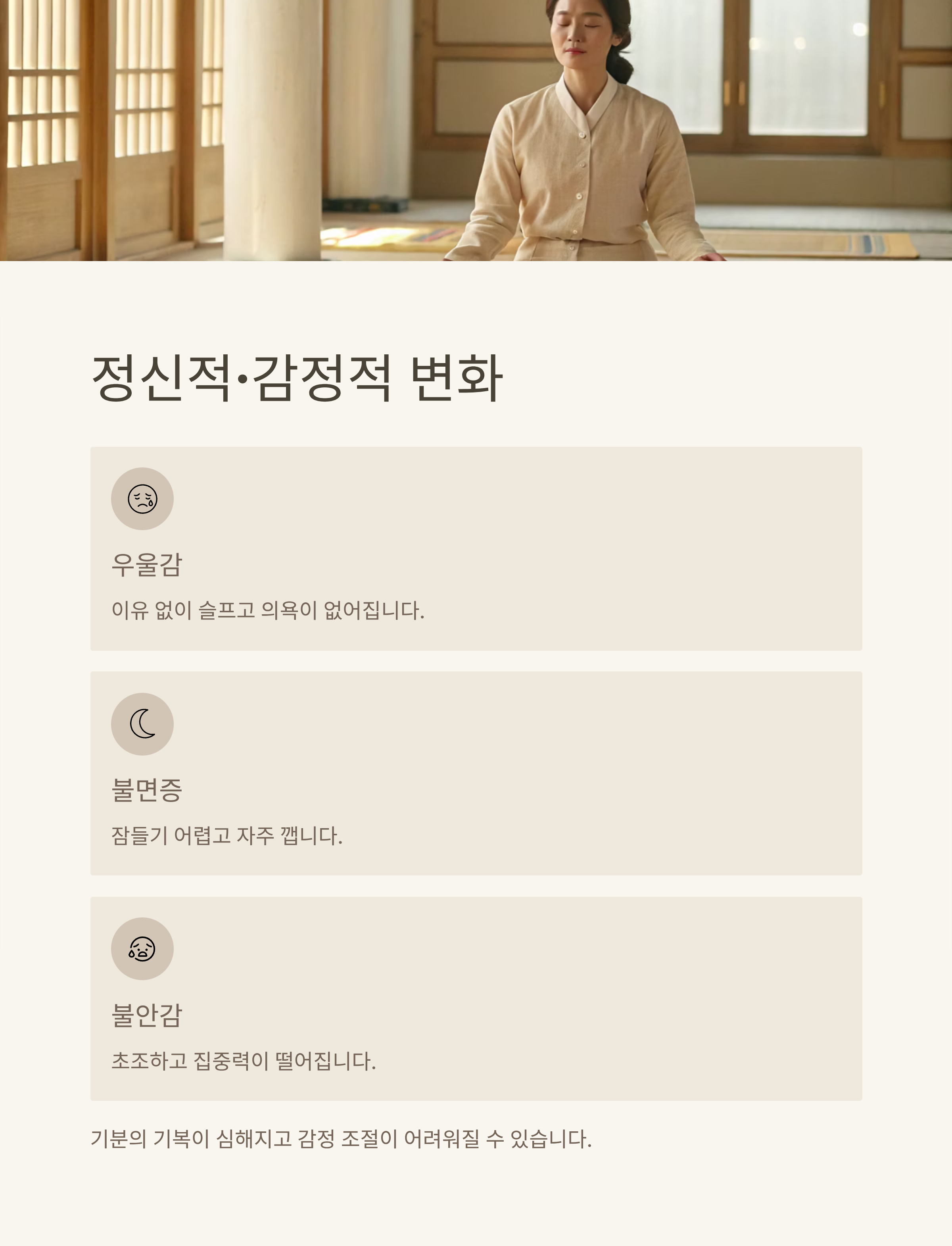 | 정신적 변화 | 우울감, 불면증, 불안감, 집중력 저하 | 기분의 기복이 심해짐 |