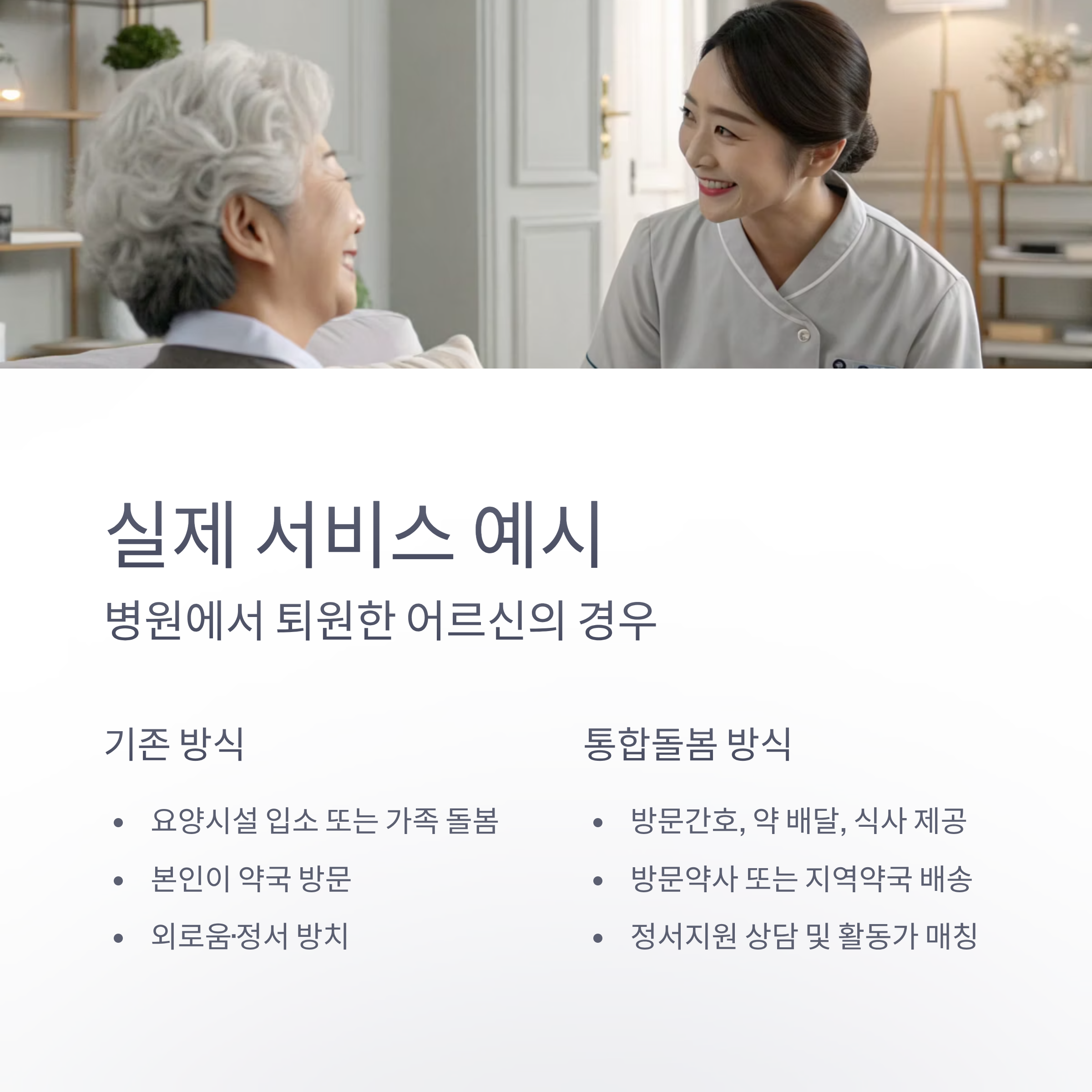 | 퇴원 후 | 요양시설 입소 또는 가족 돌봄 | 방문간호, 약 배달, 식사 제공 연계 |
