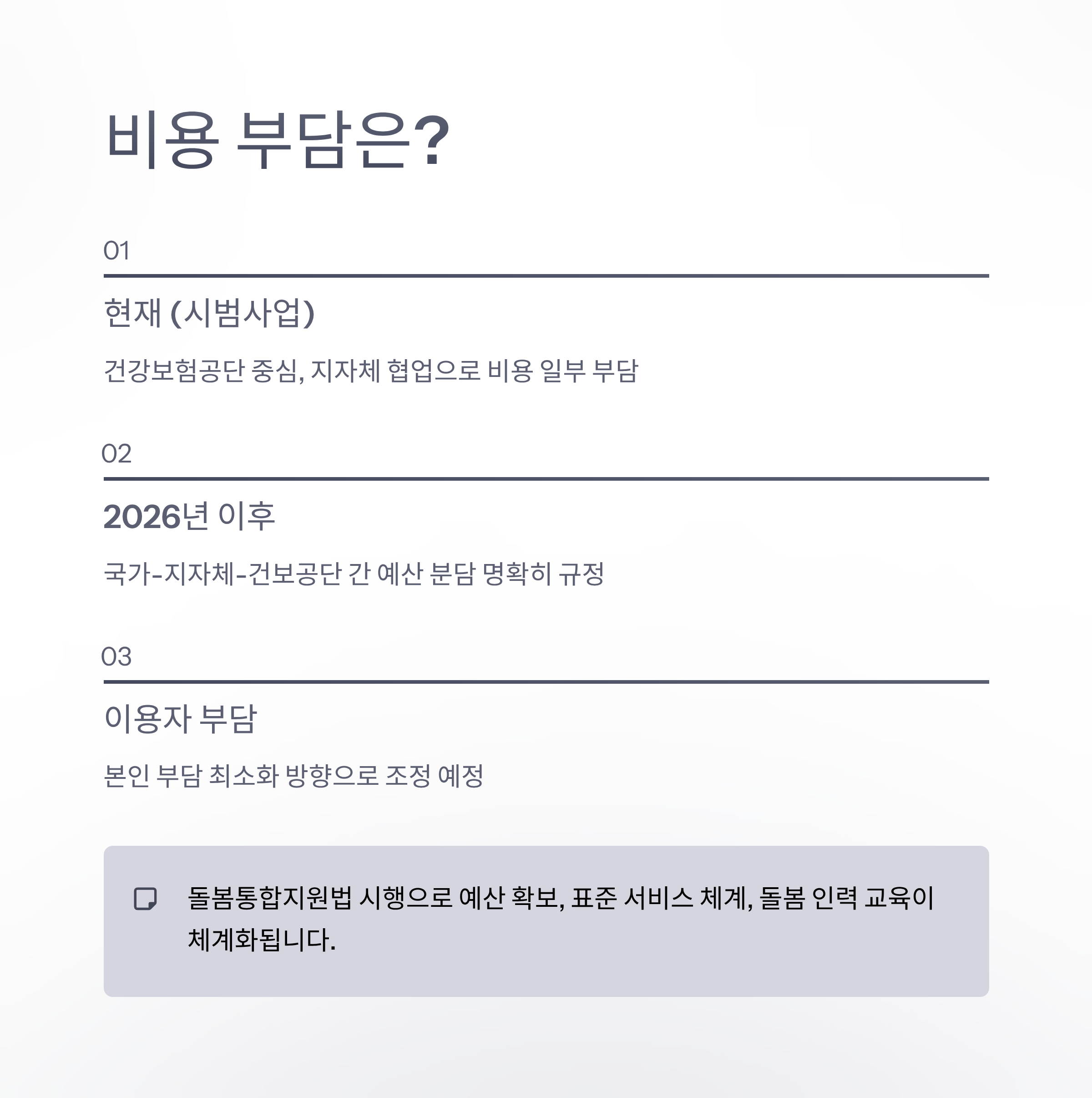 정부는 2026년 3월부터 「돌봄통합지원법」을 시행해 통합돌봄을 제도적으로 뒷받침할 예정입니다. 이를 통해 예산 확보, 표준 서비스 체계 마련, 돌봄 인력 교육 등이 보다 체계화되며 지속가능한 복지 시스템으로의 전환을 기대할 수 있습니다.