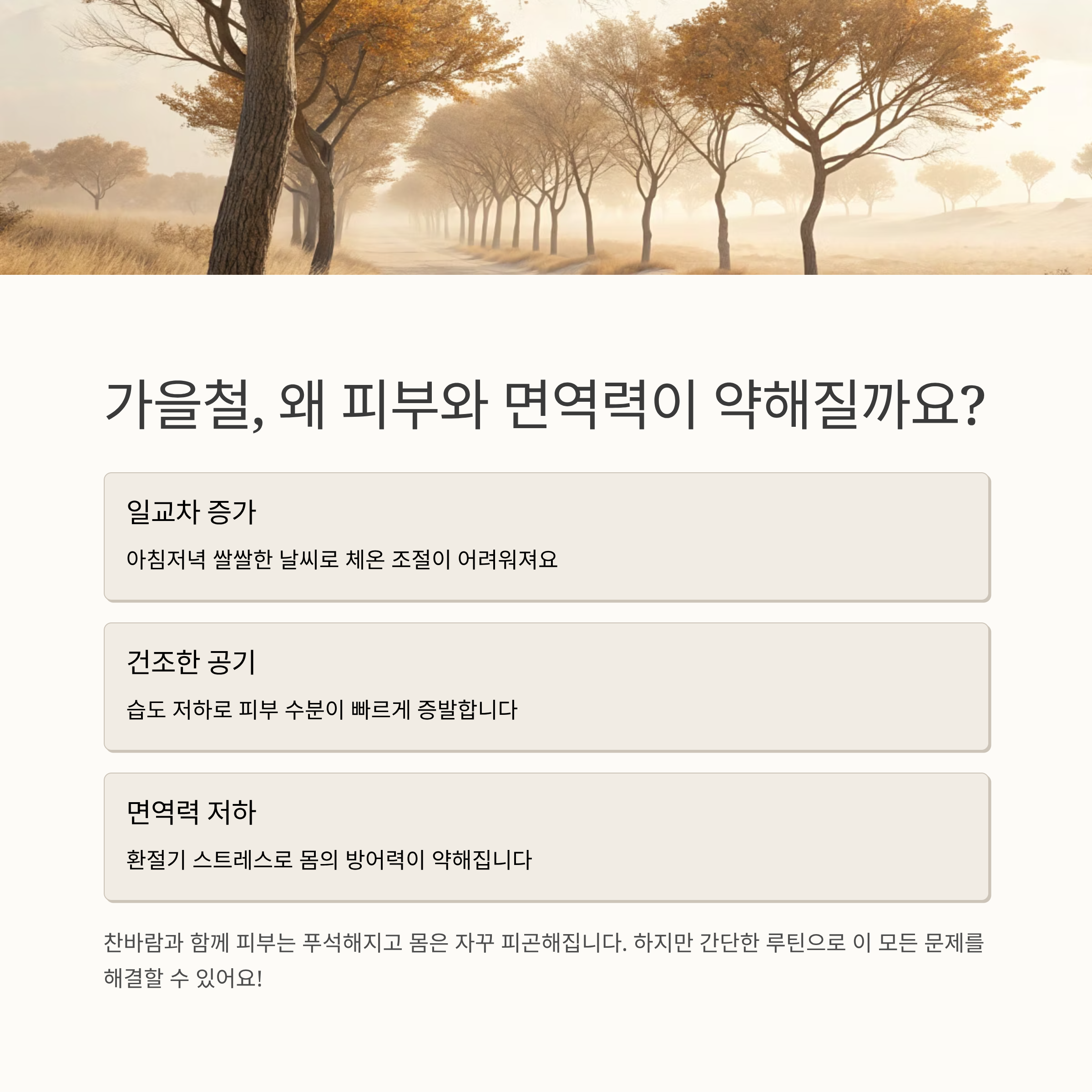 가을이 되면 찬바람과 함께 피부는 푸석해지고 몸은 자꾸 피곤해집니다. 아침저녁 쌀쌀한 날씨와 건조한 공기에 피부도 면역력도 모두 예민해지기 쉬운데요. 매일 5분만 투자하면 피부 보습은 물론 면역력까지 자연스럽게 챙길 수 있는 루틴이 있습니다. 복잡하지 않지만 효과적인 방법, 지금 바로 소개합니다.