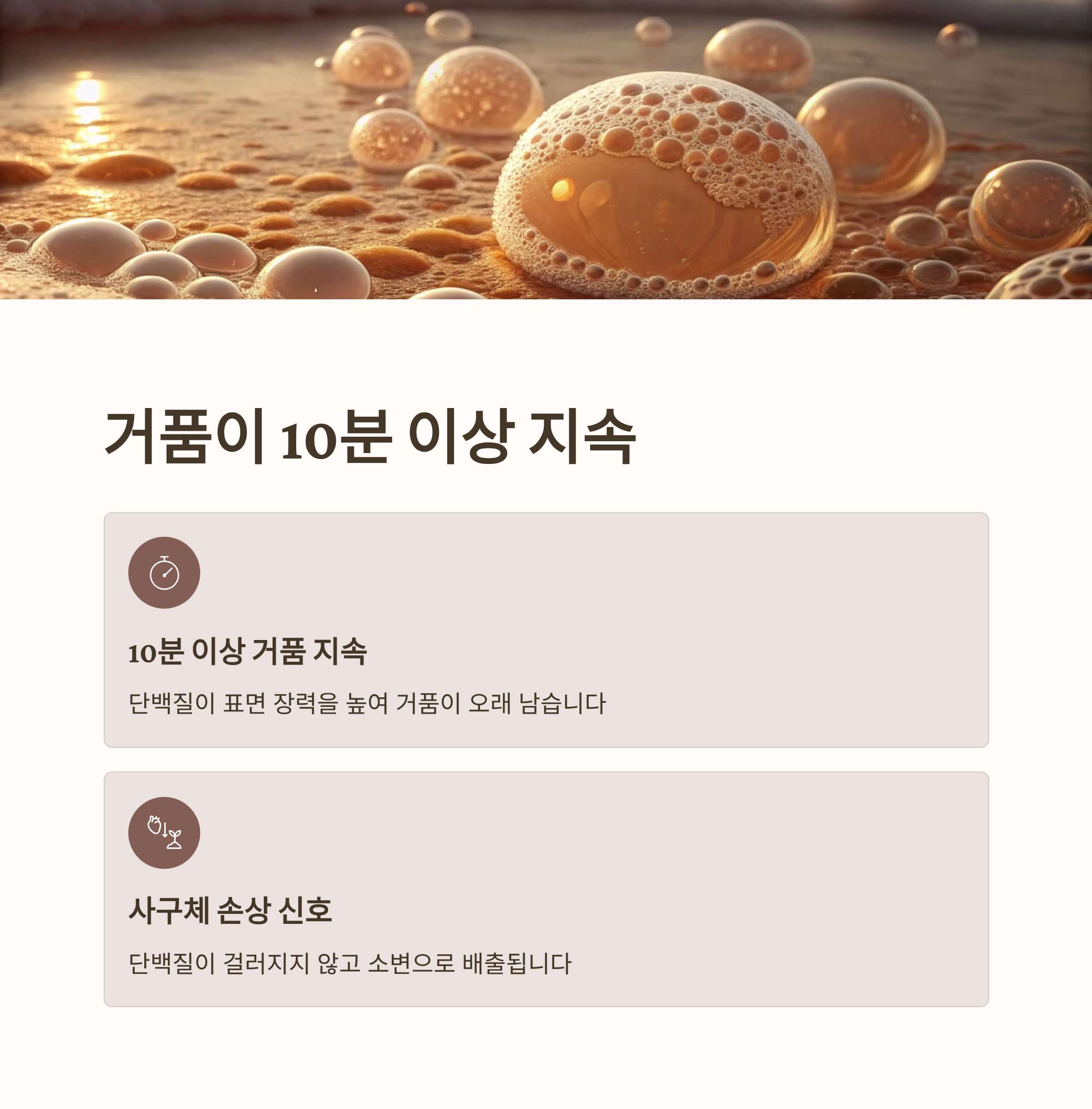 이 거품은 단백질 농도가 높을수록 더 오래 남아 있습니다. 단순히 '거품 좀 생겼네' 하고 넘길 게 아니에요.