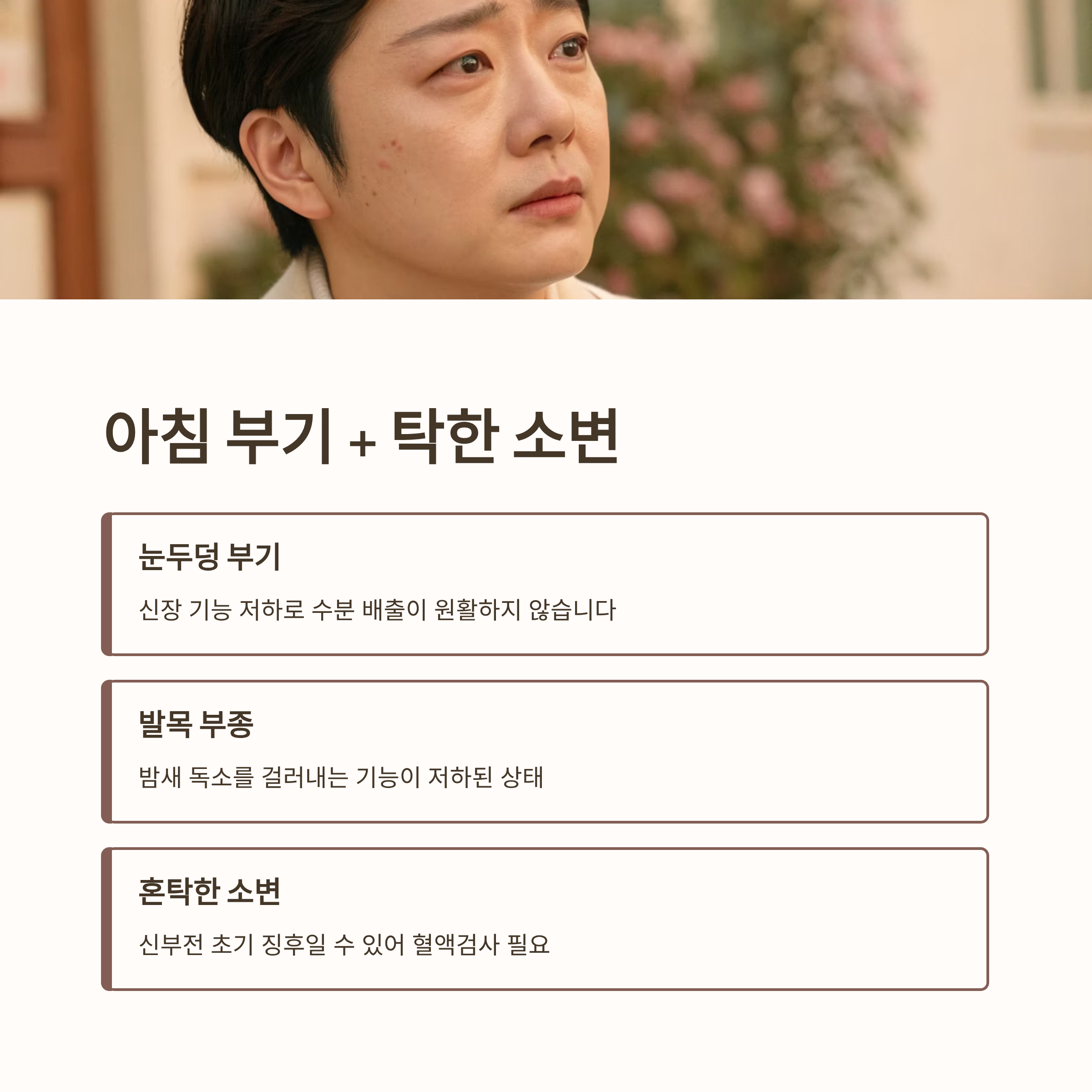 특히 아침에 눈두덩이나 발목이 붓고, 동시에 소변 색이 진하거나 혼탁하다면 단백뇨뿐 아니라 신부전 초기 징후일 수 있습니다.