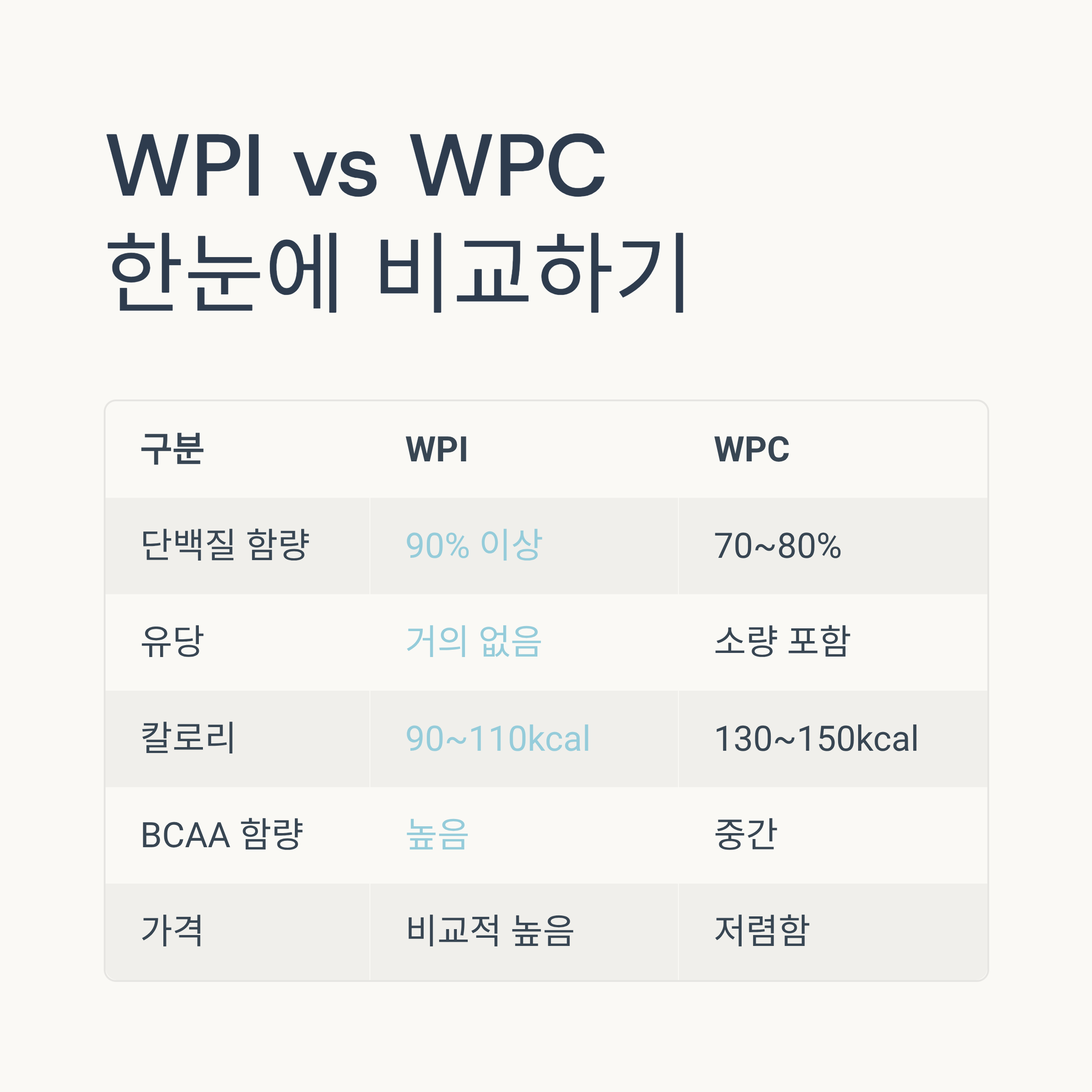 아래 표는 WPI와 WPC의 성분 비교입니다.