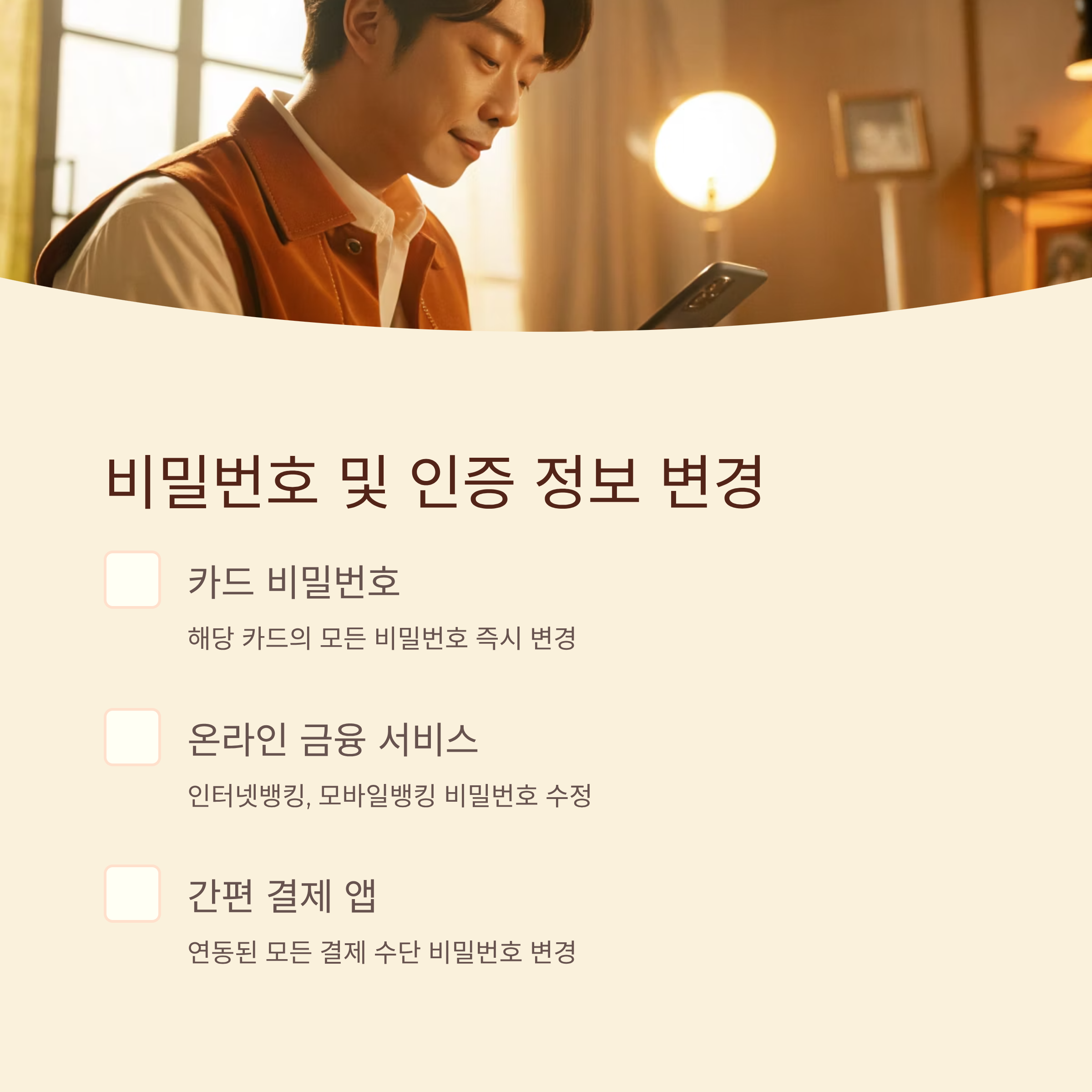 카드 비밀번호는 물론 온라인 금융 서비스, 간편 결제 앱 등 연동된 모든 결제 수단의 비밀번호를 즉시 변경해야 합니다. 동일한 비밀번호를 여러 곳에서 사용 중이었다면 모두 수정하는 것이 안전합니다.