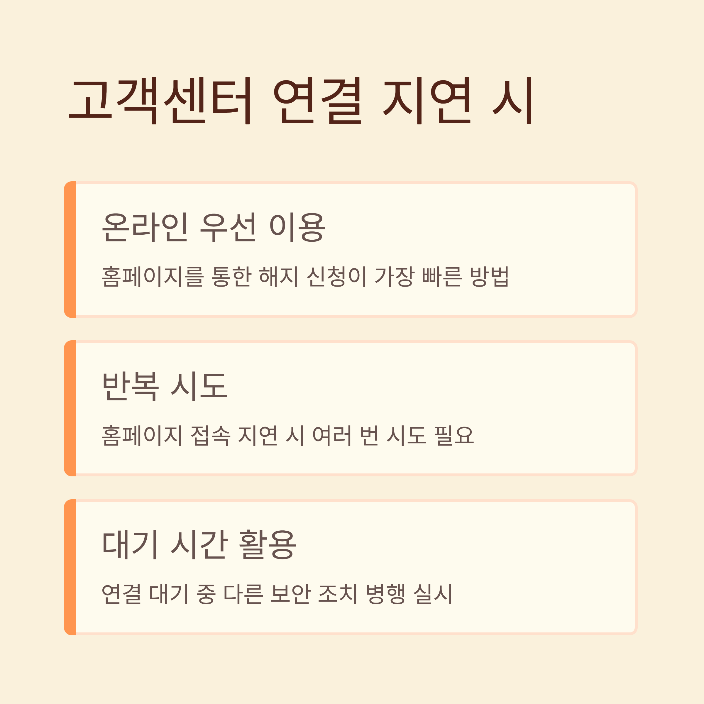 사고 직후 고객센터는 폭주로 연결이 어렵습니다. 이럴 경우 온라인 홈페이지를 통한 해지 신청이 가장 빠른 방법입니다. 다만 홈페이지 역시 접속이 지연될 수 있으니 여러 번 시도하는 것이 좋습니다.