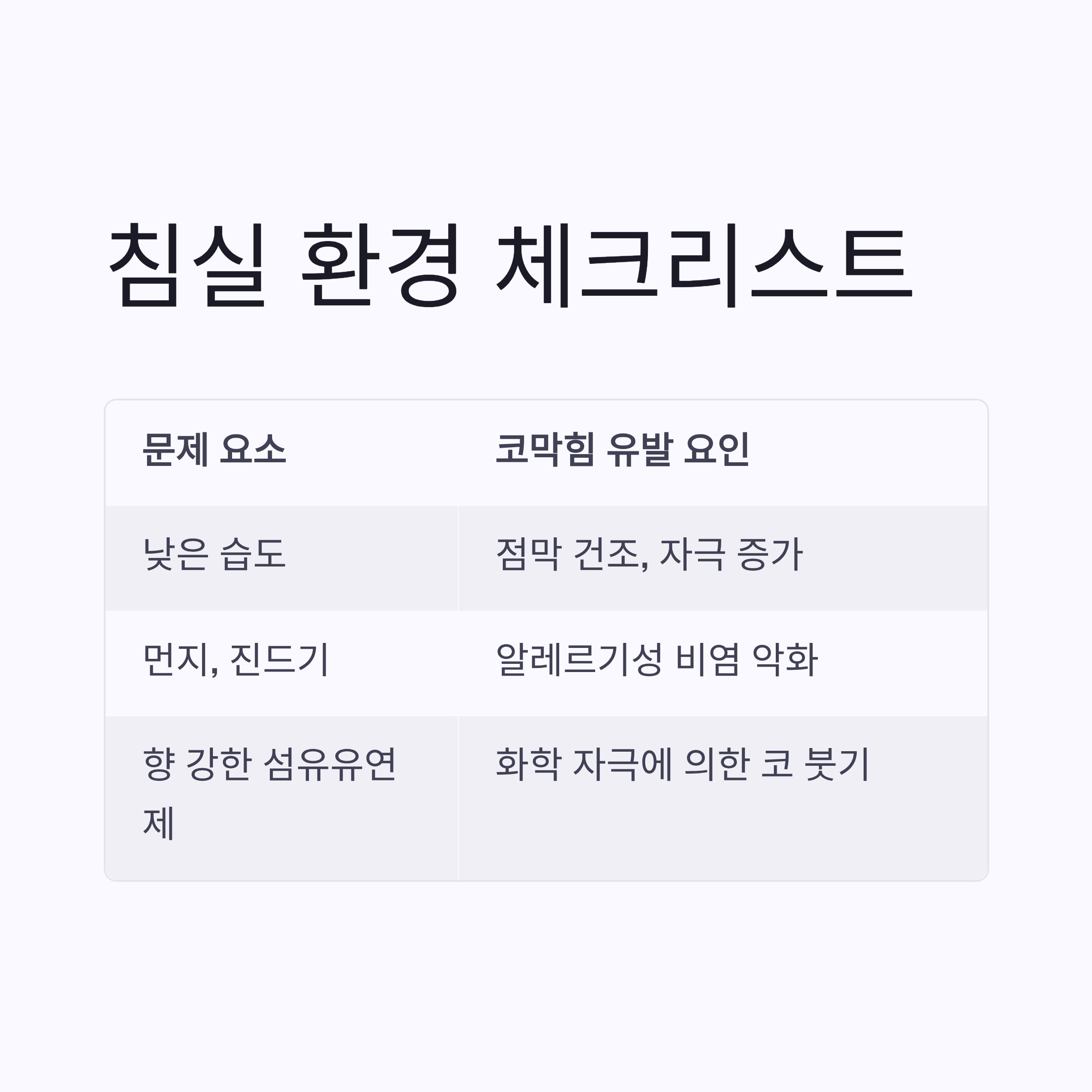 | 실내 온도 20~22℃ 유지 | ☐ | 너무 덥거나 건조한 환경은 점막 자극 유발 |