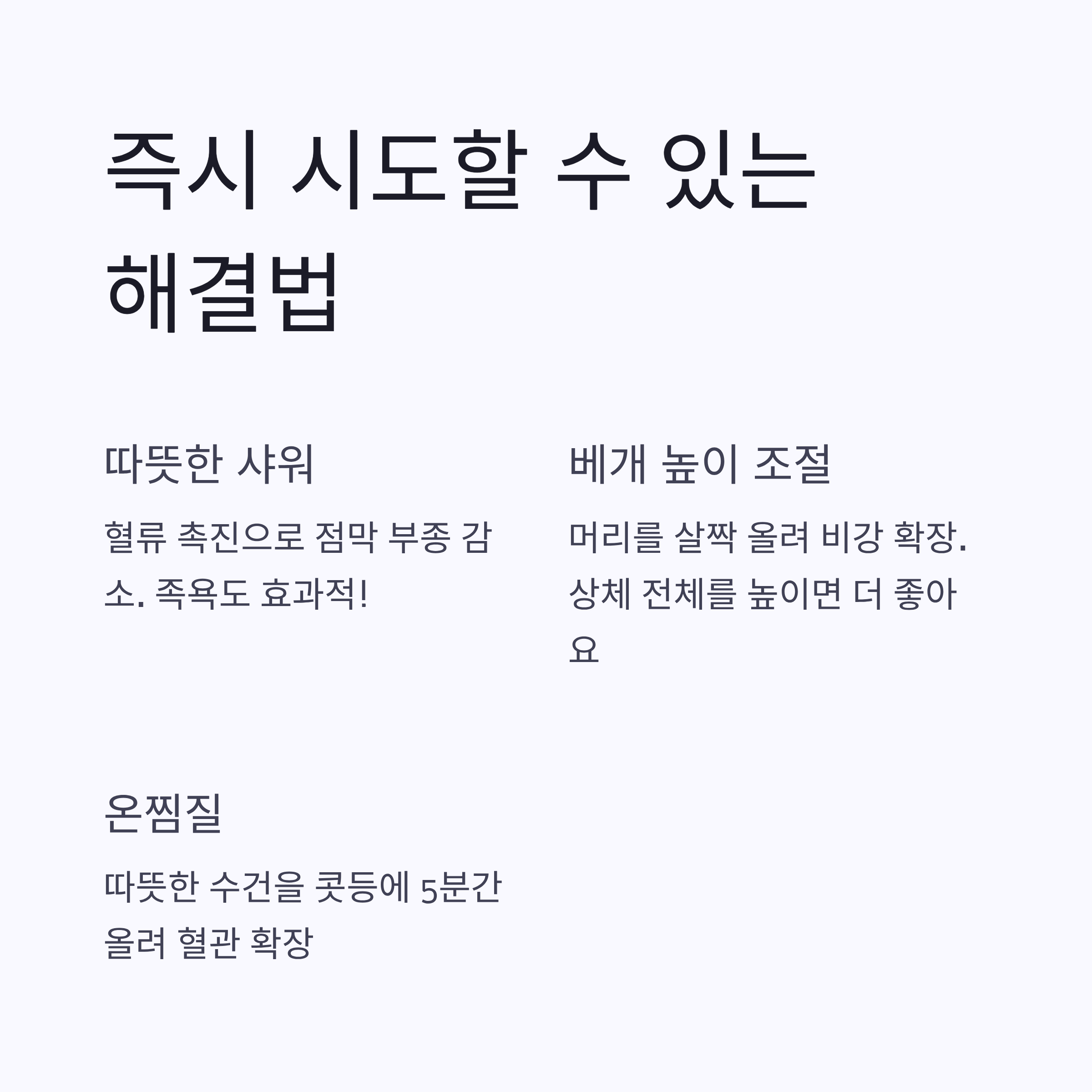 | Day 2 | 창문 열고 환기 10분, 비강 세척 | 족욕 10분(40도 내외), 수분 1컵 | 복식호흡 5분, 실내 습도 50% 유지 |