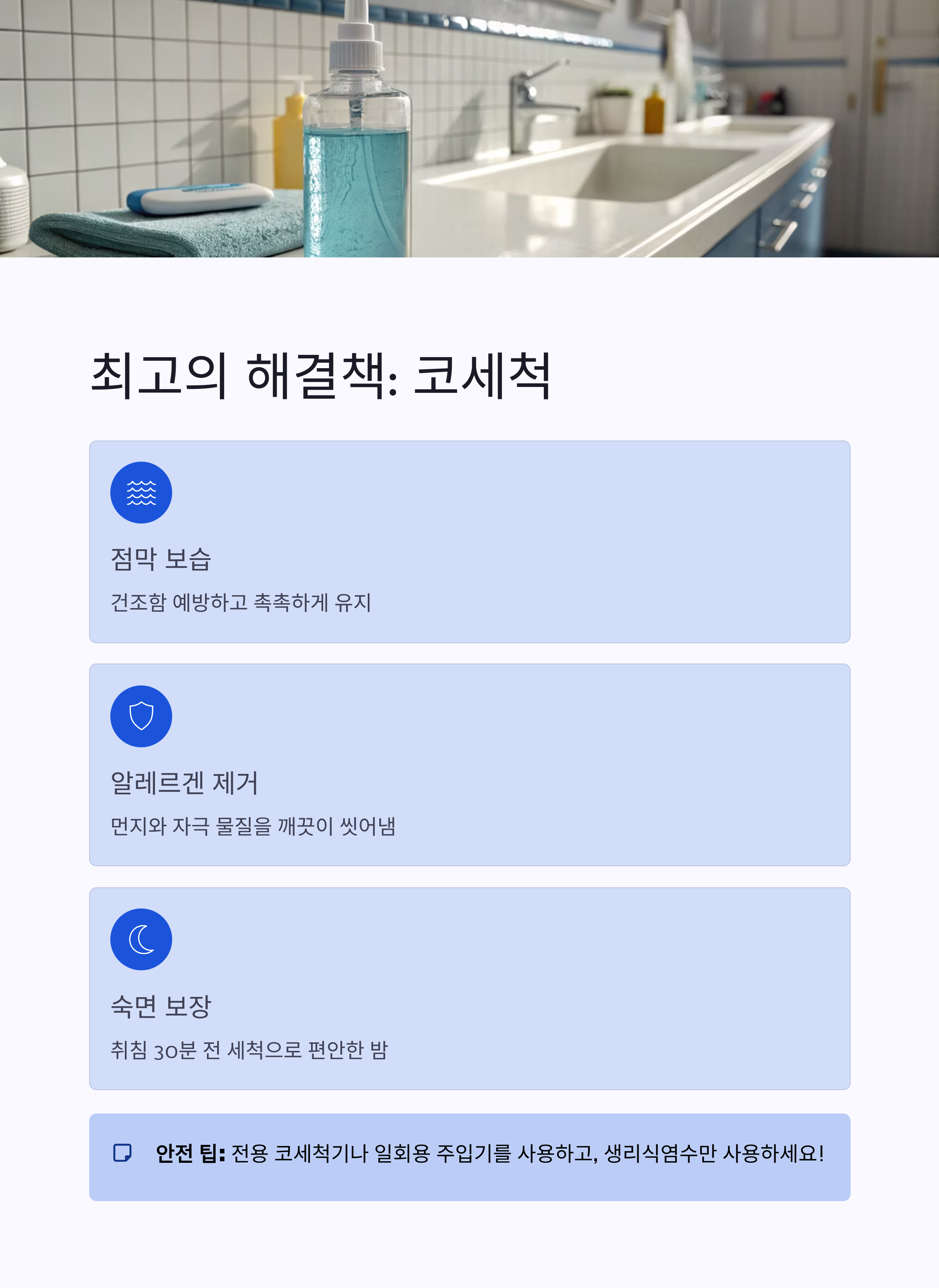 취침 30분 전 생리식염수로 부드럽게 세척하면 숨길이 뚫리고 코막힘 없이 편안하게 잠들 수 있습니다. 사용 시엔 꼭 전용 코세척기나 일회용 주입기를 사용하는 것이 안전합니다.