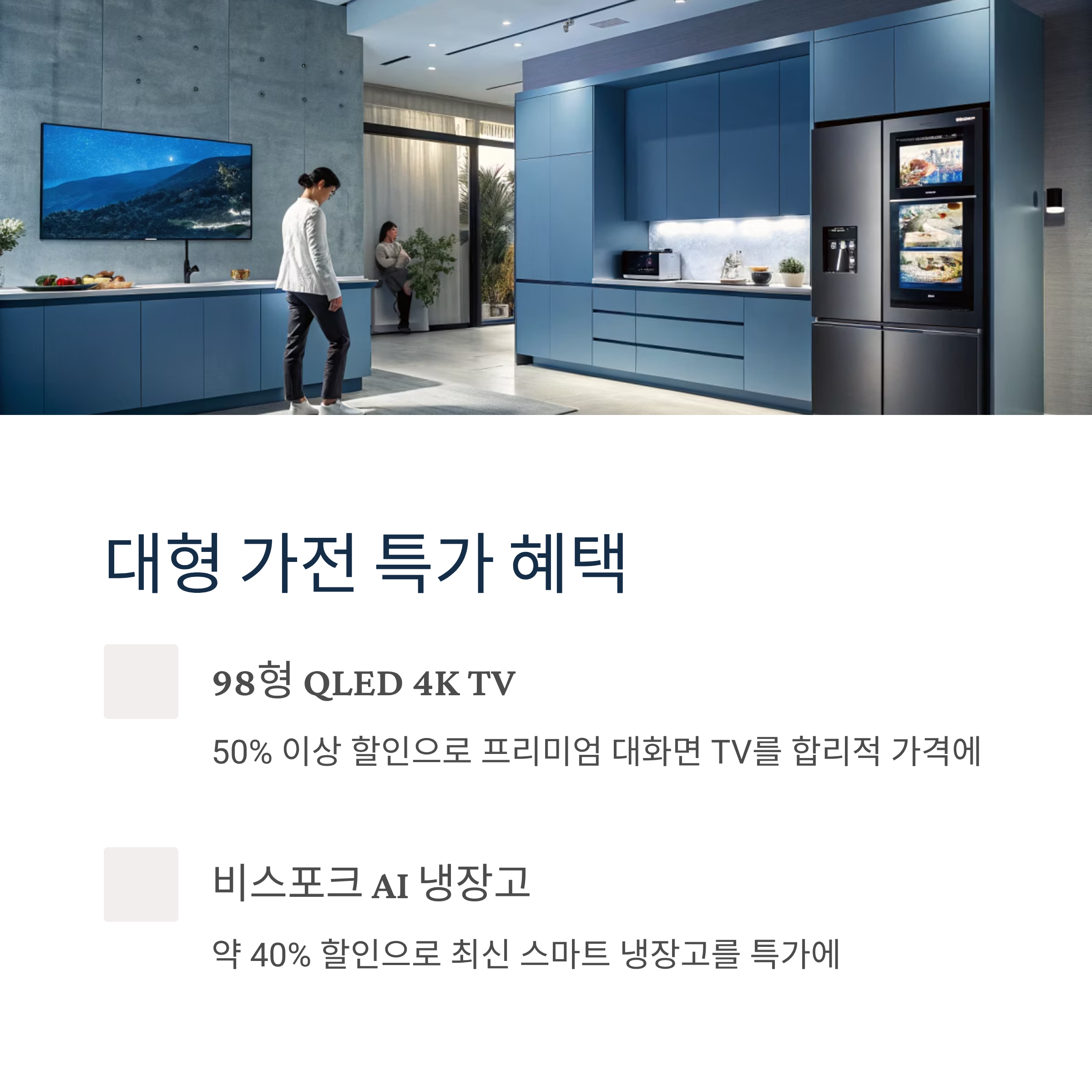대표적인 할인 품목으로는 98형 QLED 4K TV가 50% 이상, 비스포크 AI 냉장고는 약 40% 할인 혜택을 제공합니다. 실속 있는 가격으로 최신 프리미엄 가전을 마련할 수 있습니다.