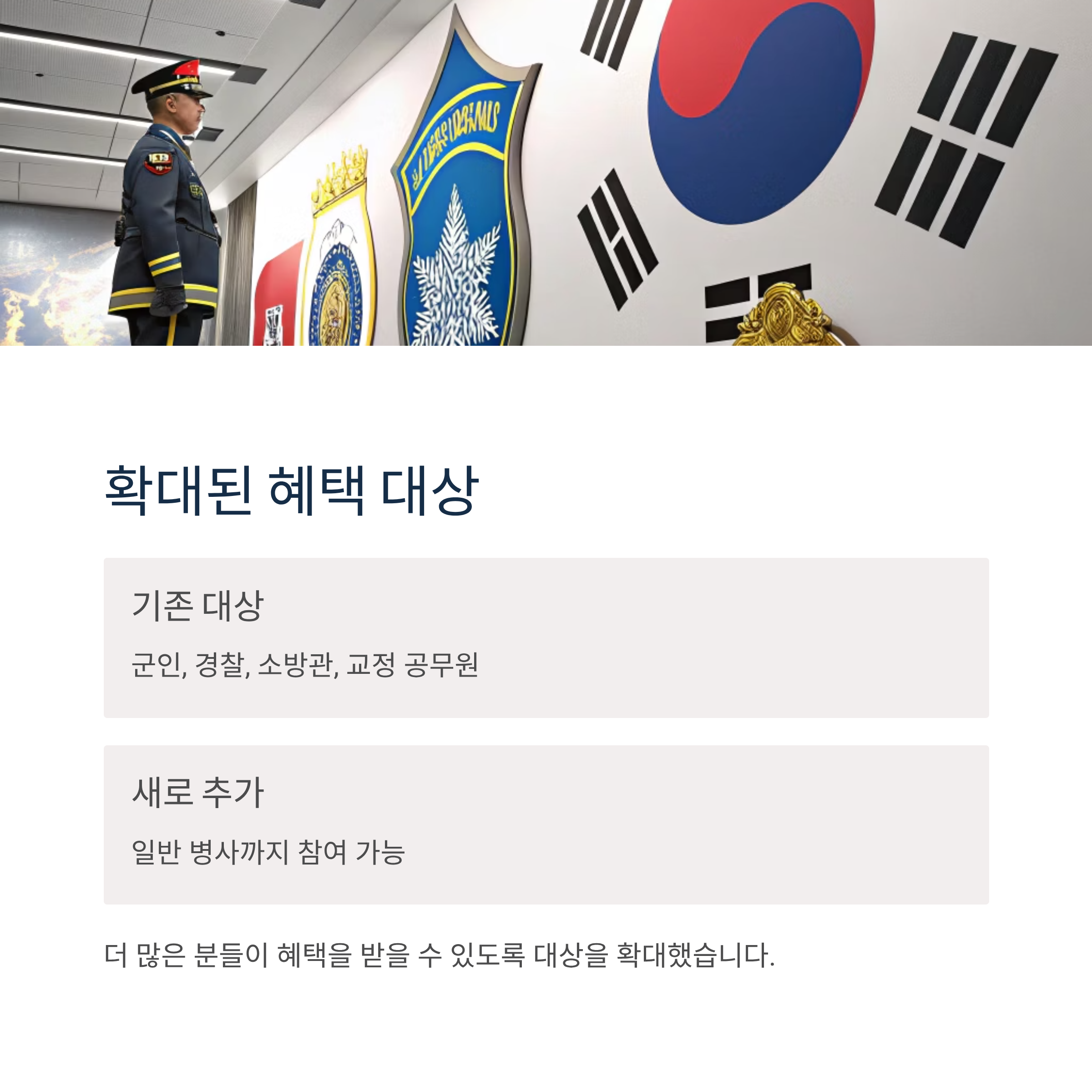 | 대상 | 군인, 경찰, 소방, 교정 공무원, 일반 병사 |