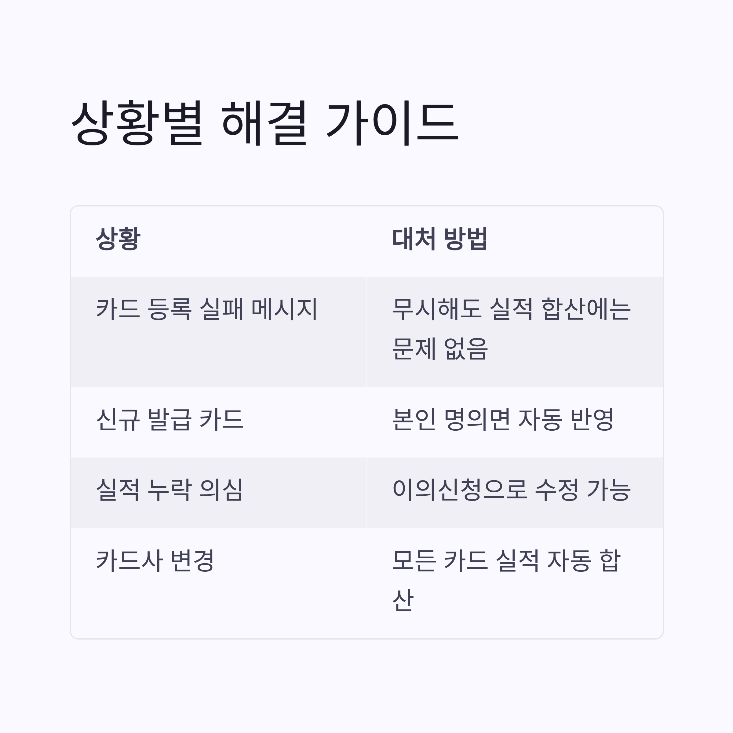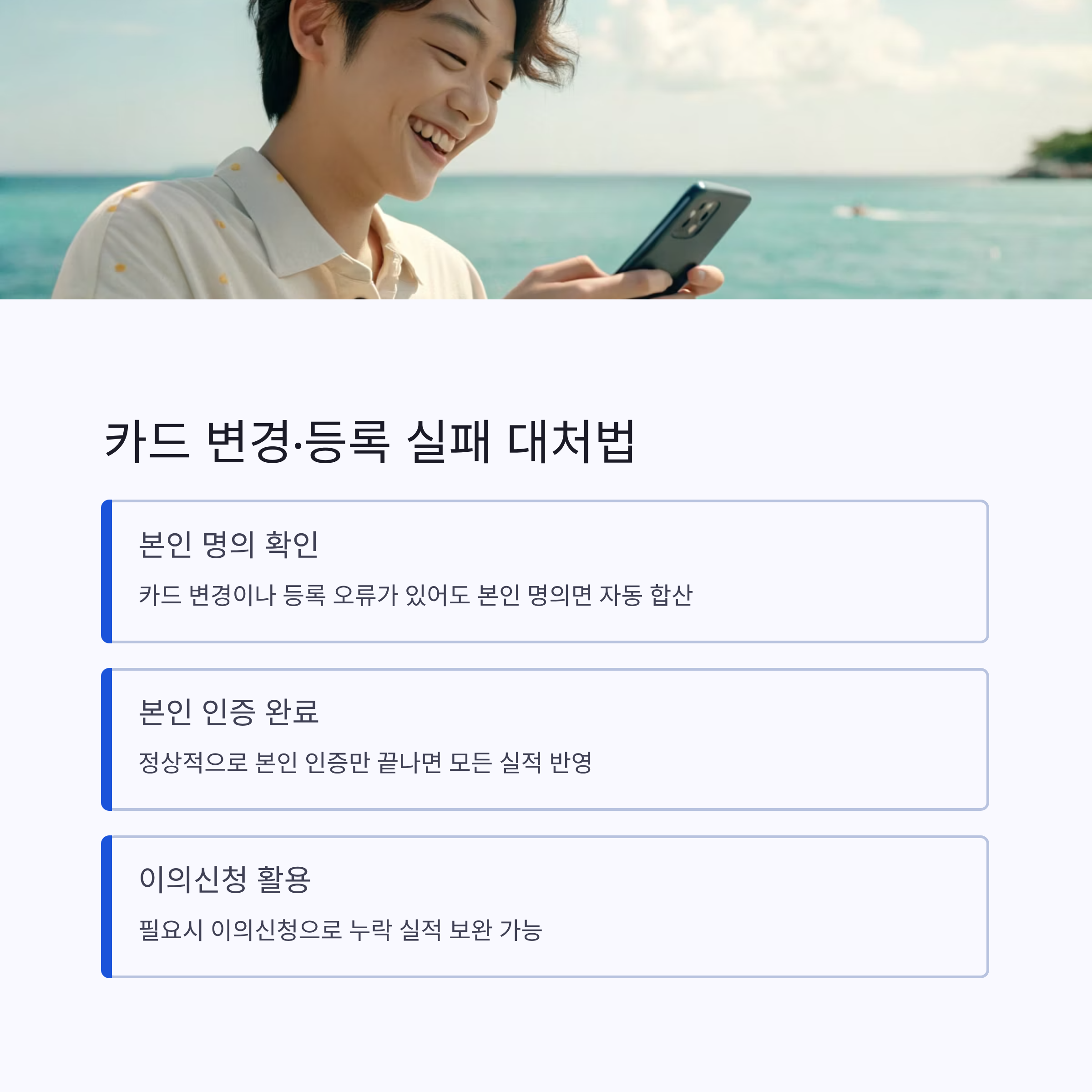 카드 변경이나 등록 오류가 있어도 본인 명의 카드라면 자동 합산되므로 걱정할 필요가 없습니다. 본인 인증만 정상적으로 끝냈다면 실적은 모두 반영되며, 필요 시 이의신청으로 보완할 수 있습니다.