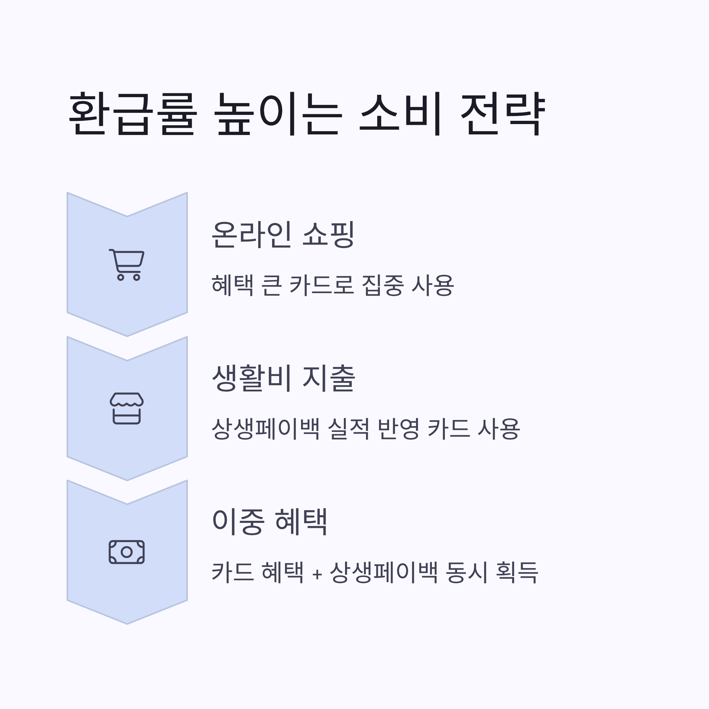효율적으로 환급을 받으려면 결제처를 전략적으로 나누는 게 좋습니다. 예를 들어 온라인 쇼핑은 혜택이 큰 카드로 집중하고, 생활비 지출은 상생페이백 실적 반영 카드로 사용하는 방식이 효과적입니다. 이렇게 하면 카드 혜택과 상생페이백 환급을 동시에 누릴 수 있습니다.