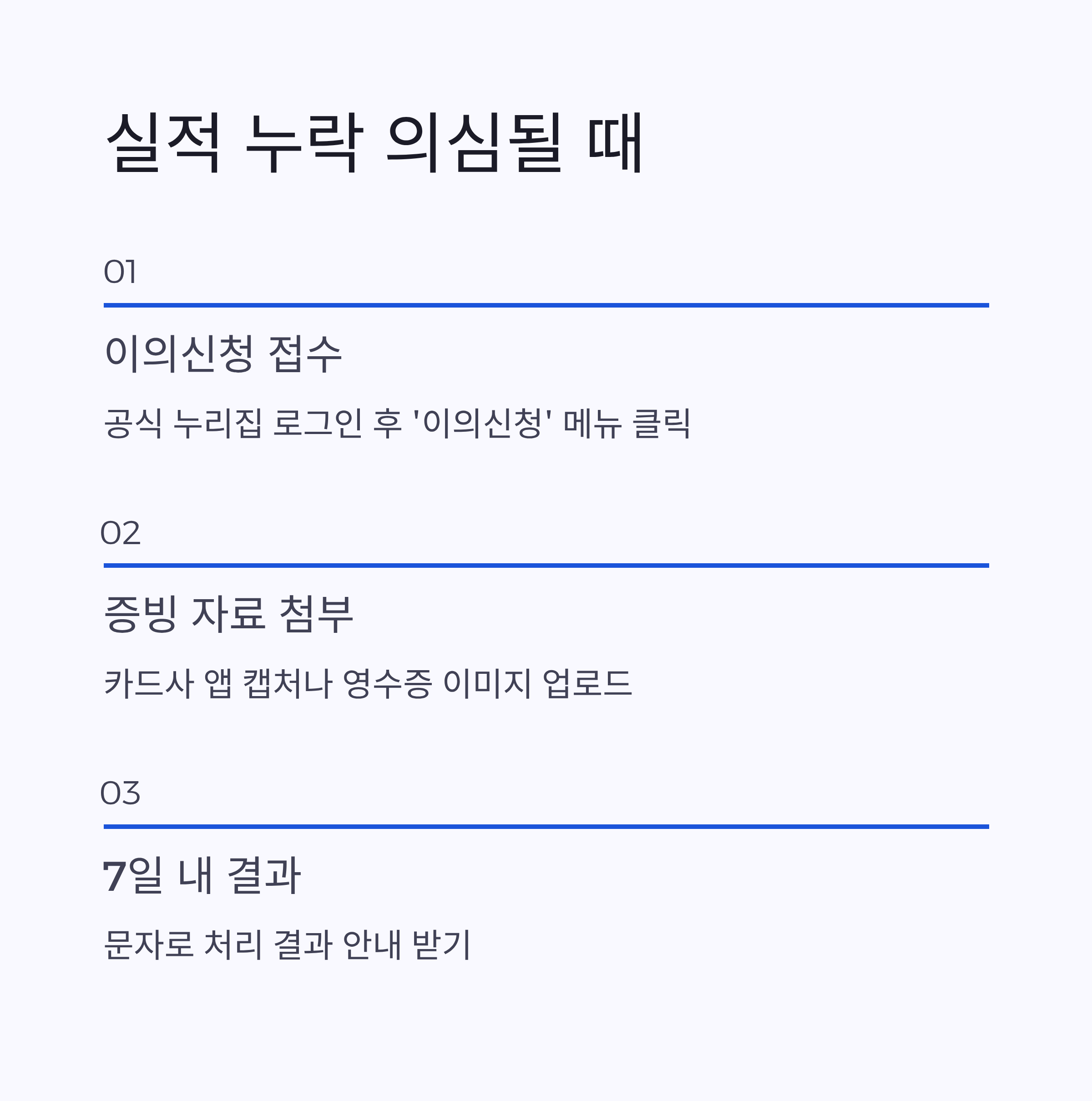 혹시 계산해본 환급액이 너무 적다면 이의신청 절차를 이용하세요. 공식 누리집에 로그인 후 ‘이의신청’ 메뉴에서 누락된 결제 내역을 작성하고, 카드사 앱 캡처나 영수증 이미지를 첨부하면 됩니다. 접수 후 보통 7일 내에 결과가 문자로 안내됩니다.