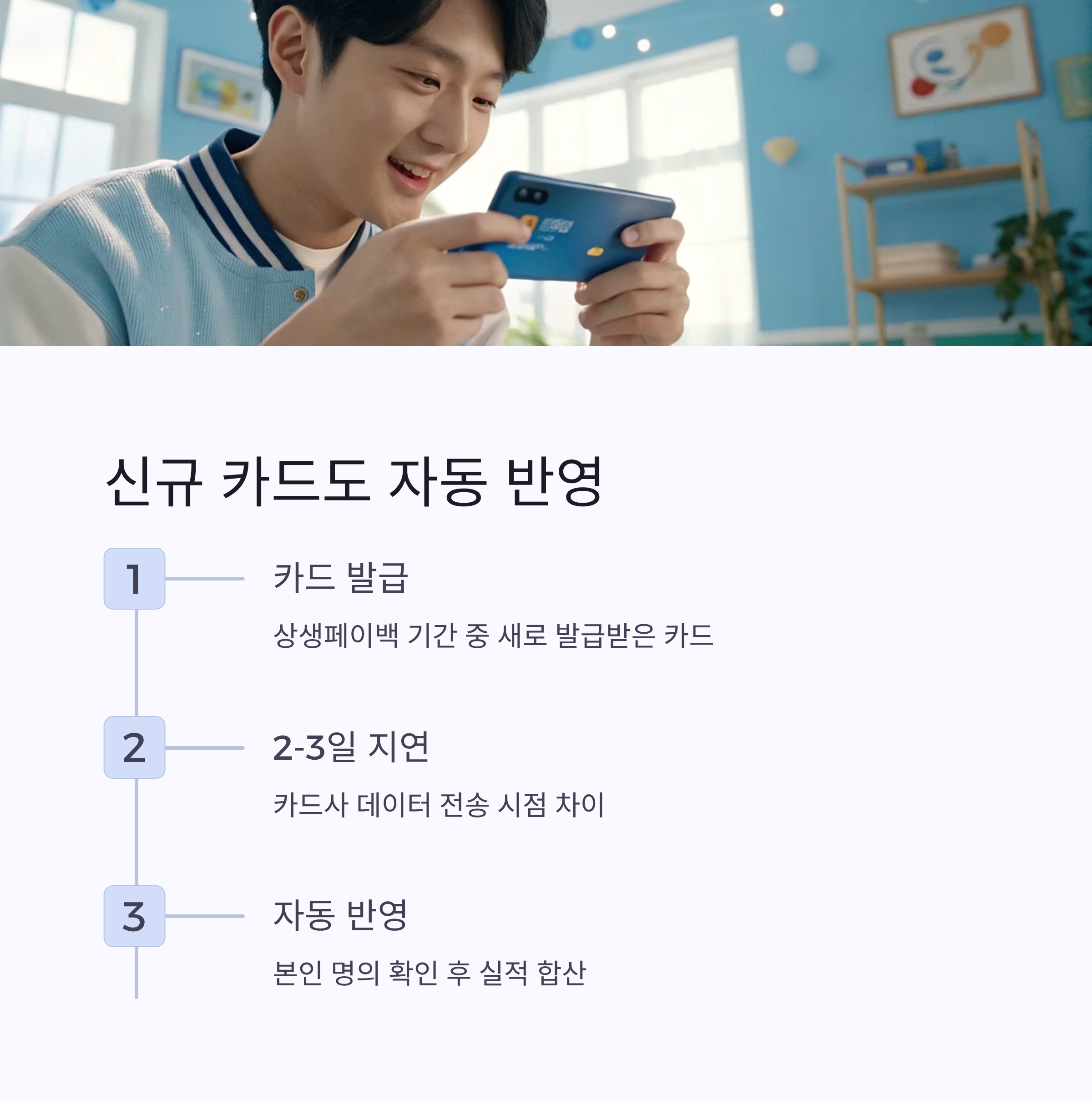 상생페이백 기간 동안 새로 발급받은 카드 역시 본인 명의라면 자동 반영됩니다. 다만 카드사에서 데이터를 전송하는 시점 때문에 2~3일 정도 지연될 수 있으니, 월말 사용 내역은 집계 시점 차이를 감안하는 게 좋습니다.
