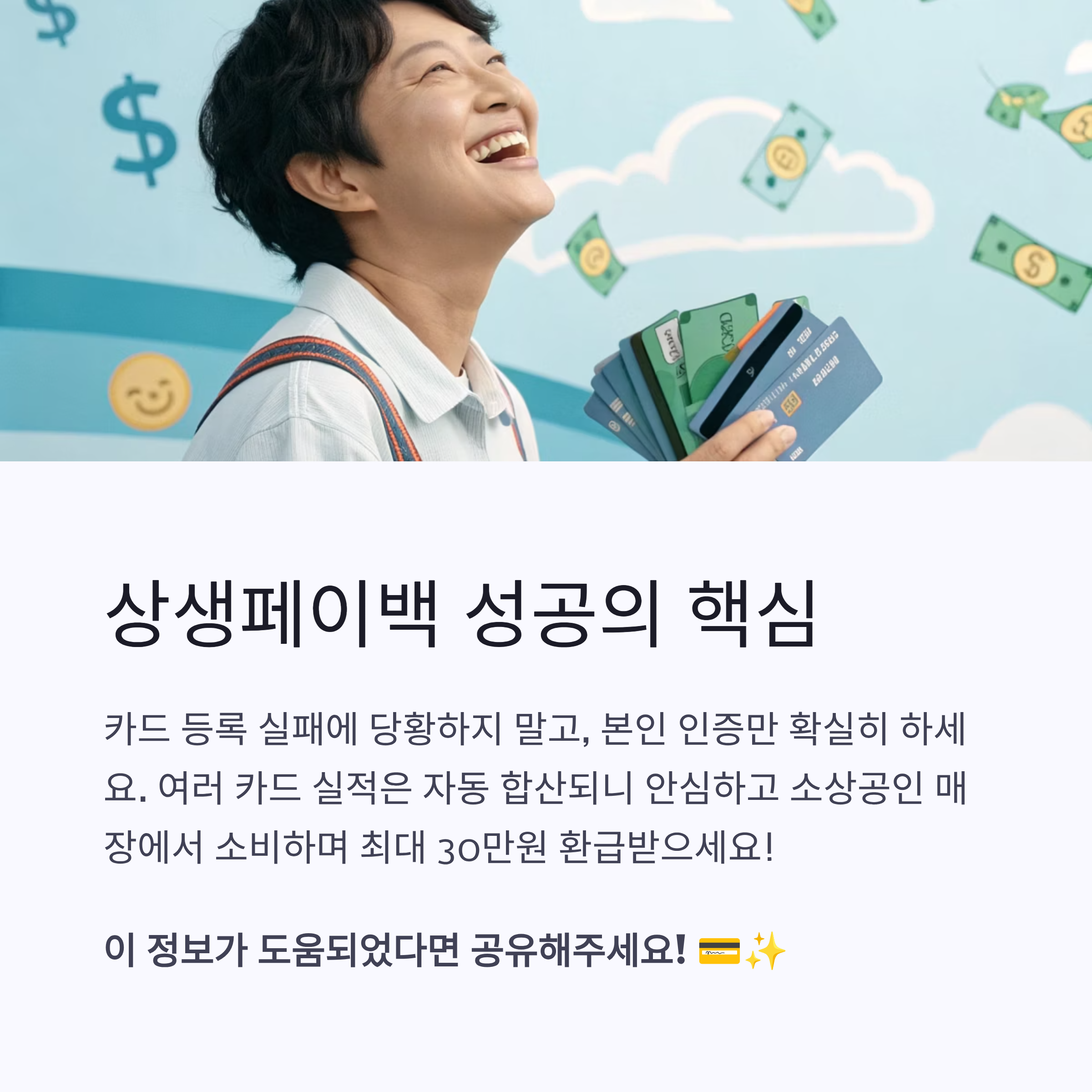 상생페이백 제도는 카드 사용액 증가분을 기준으로 최대 30만 원까지 환급받을 수 있는 정책으로 큰 주목을 받고 있습니다. 하지만 여러 장의 카드를 사용하는 분들은 등록 과정에서 실패 메시지를 받거나, 카드별 실적 합산이 잘 되는지 걱정하곤 하시죠. 이번 글에서는 카드 등록 실패 시 당황하지 않고 해결하는 방법, 여러 카드 사용자의 실적 합산 원리, 그리고 환급률을 높이는 소비 전략까지 정리해 드리겠습니다.