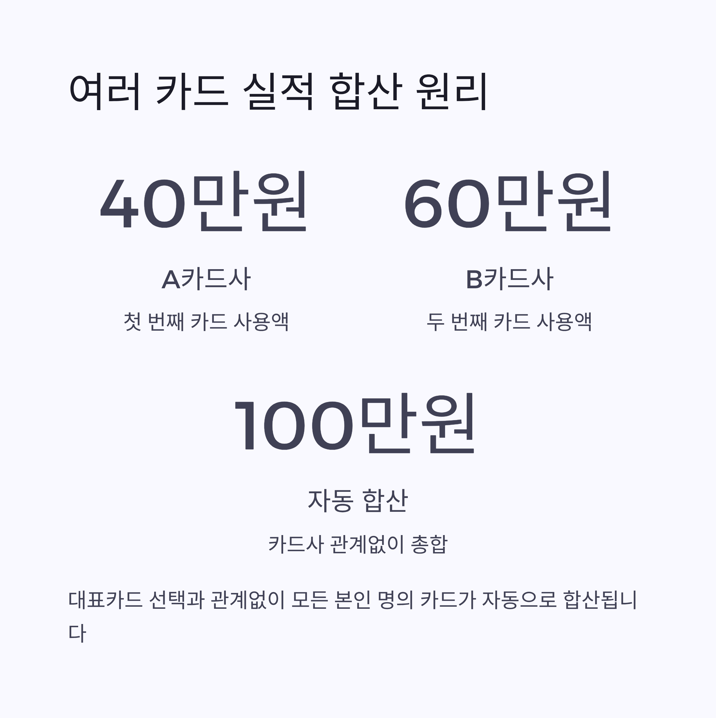 대표카드를 선택한다고 해서 그 카드만 실적으로 잡히는 것은 아닙니다. A카드사에서 40만 원, B카드사에서 60만 원을 사용했다면 자동으로 100만 원으로 합산 처리됩니다. 이는 카드사와 관계없이 동일하게 적용되므로 카드별로 따로 등록할 필요가 없습니다.