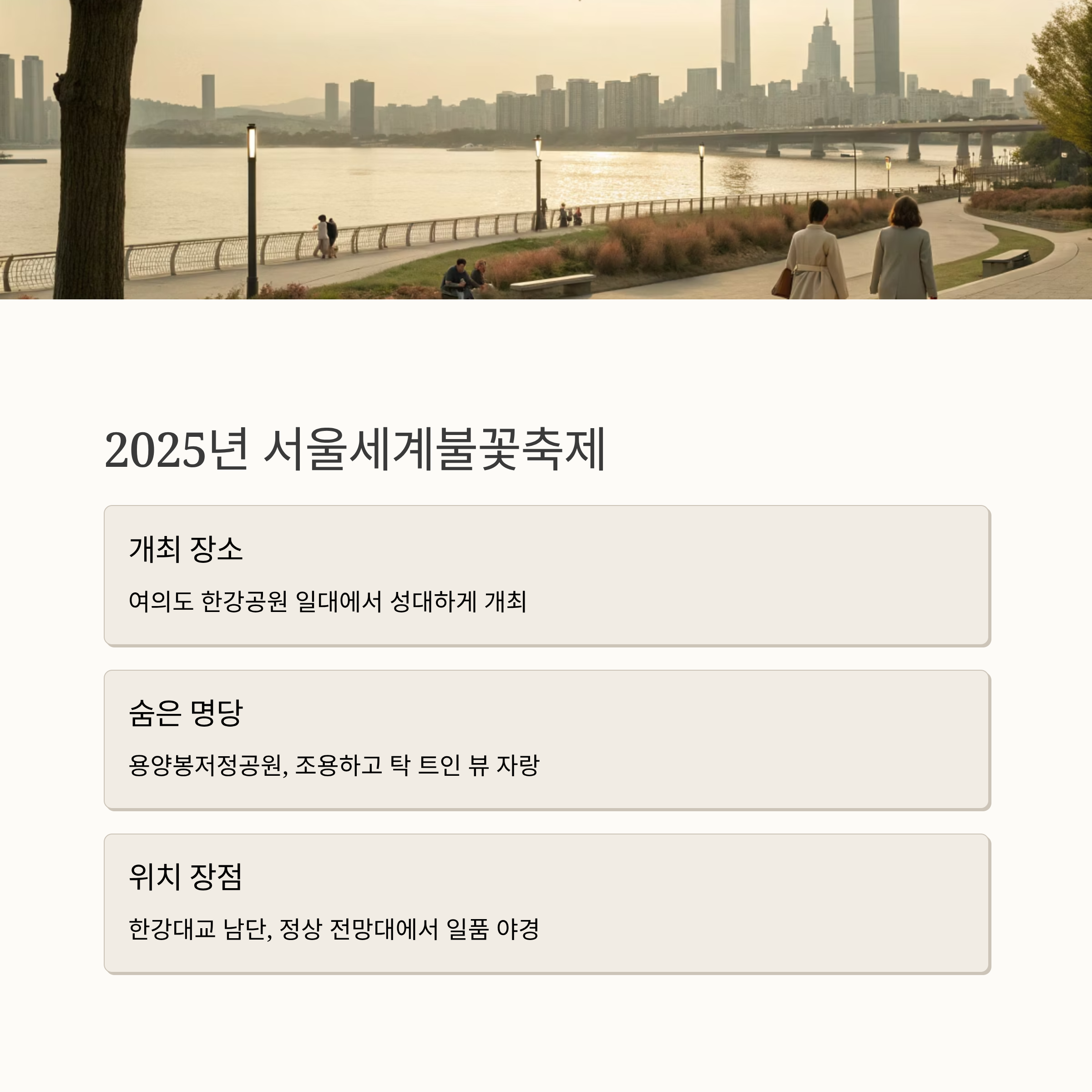 2025년 서울세계불꽃축제가 여의도 한강공원 일대에서 개최되며,