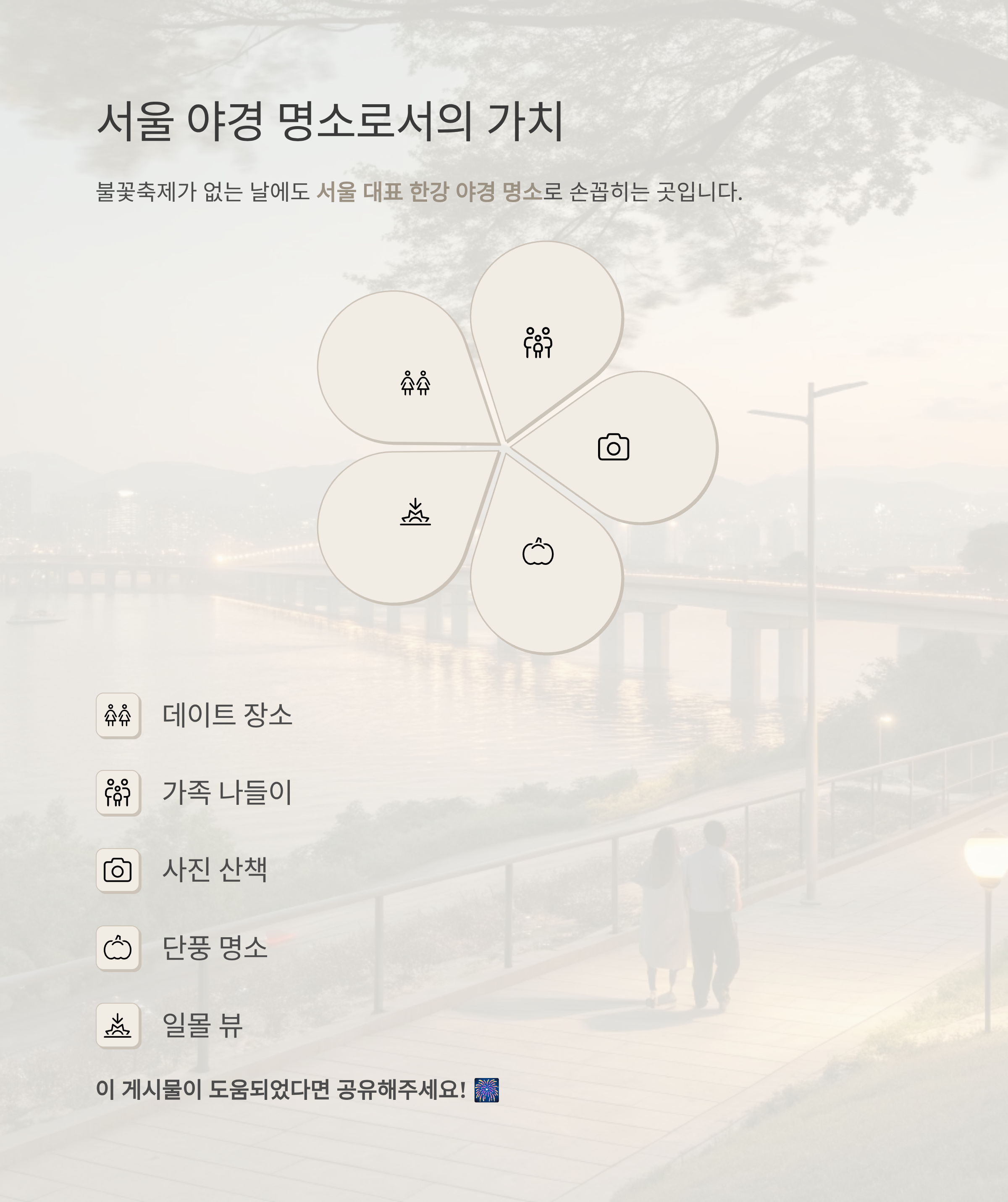 | 만족 후기 | "사람 적고 여유로웠다", "노들섬, 불꽃까지 한눈에" |