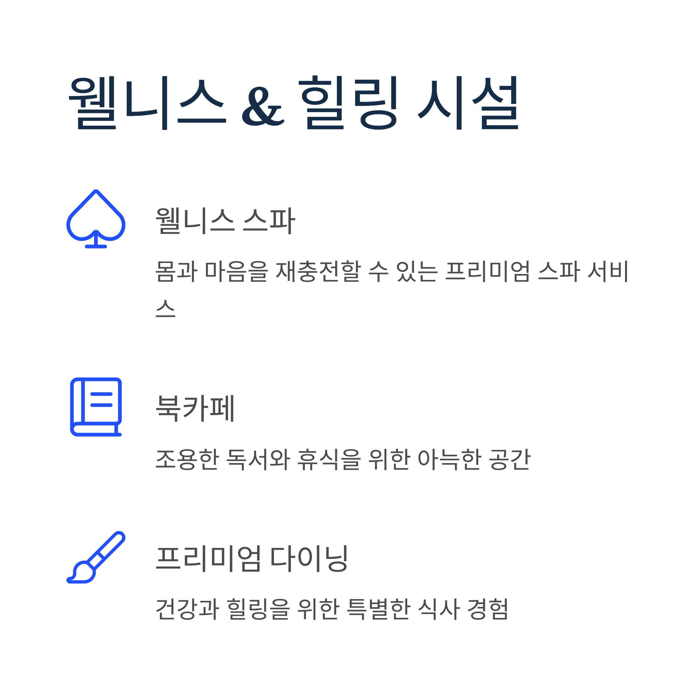 웰니스 스파와 북카페, 프리미엄 다이닝 등 건강과 힐링을 위한 공간이 마련되어 있습니다. 단순한 숙박을 넘어 몸과 마음을 재충전할 수 있는 경험을 제공합니다.