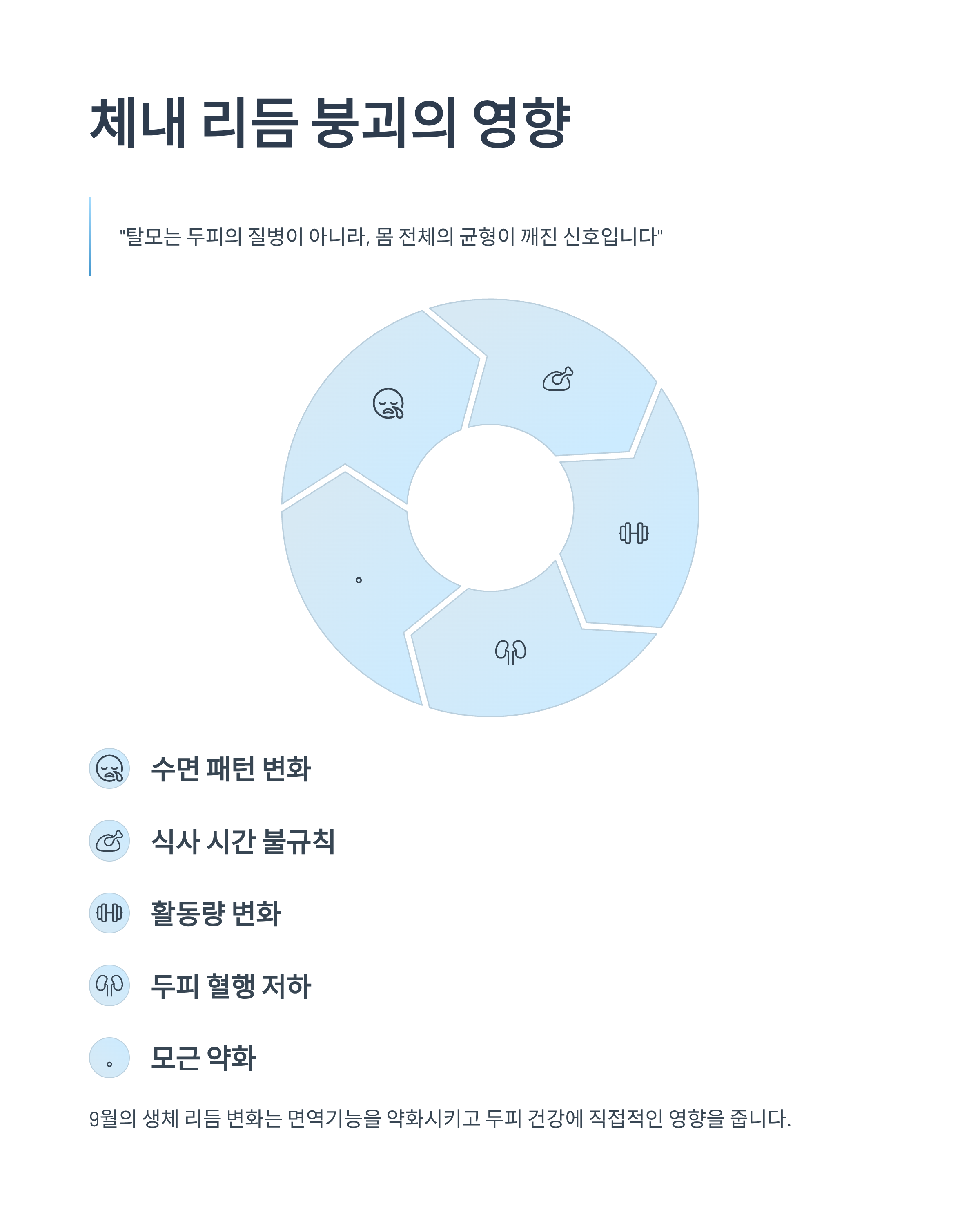 수면 패턴, 식사 시간, 활동량 변화는 모두 두피 혈행에 영향을 주고, 이로 인해 모근이 약해지면서 머리카락이 쉽게 빠지는 상태가 됩니다.