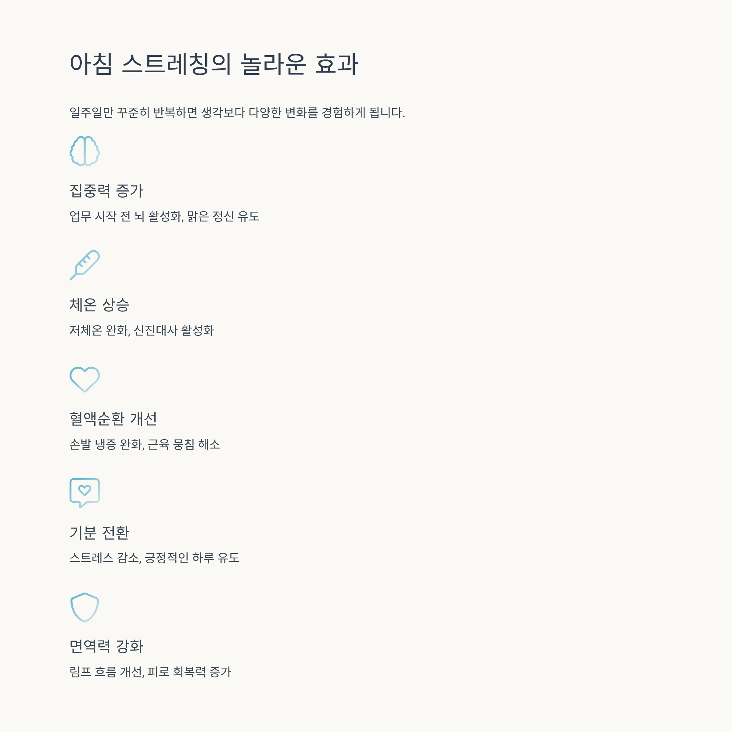 처음에는 단순히 "몸 좀 덜 피곤해졌네?"로 느낄 수 있어요. 하지만 일주일만 꾸준히 반복해 보면, 아침 스트레칭은 생각보다 다양한 변화를 만들어냅니다.