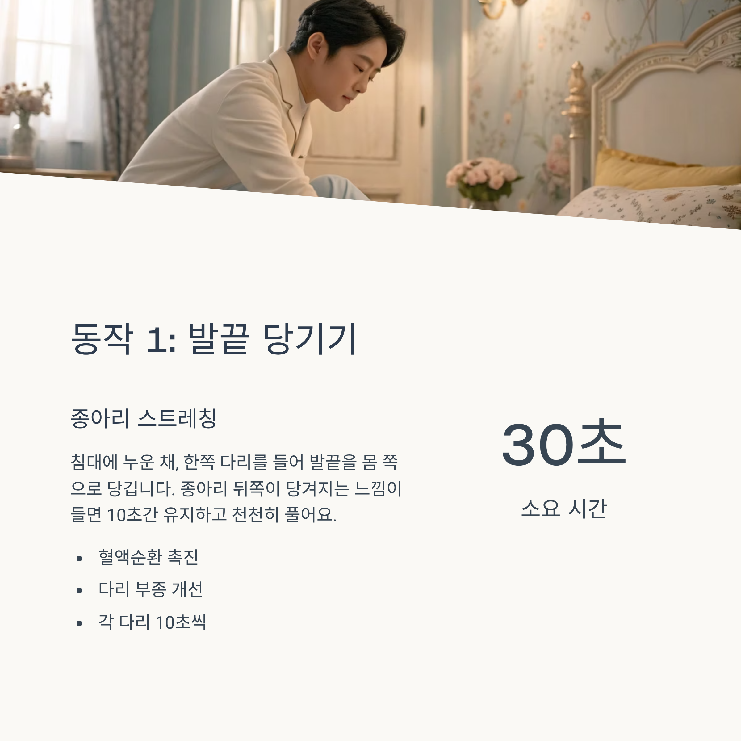 침대에 누운 채, 한쪽 다리를 들어 발끝을 몸 쪽으로 당깁니다.