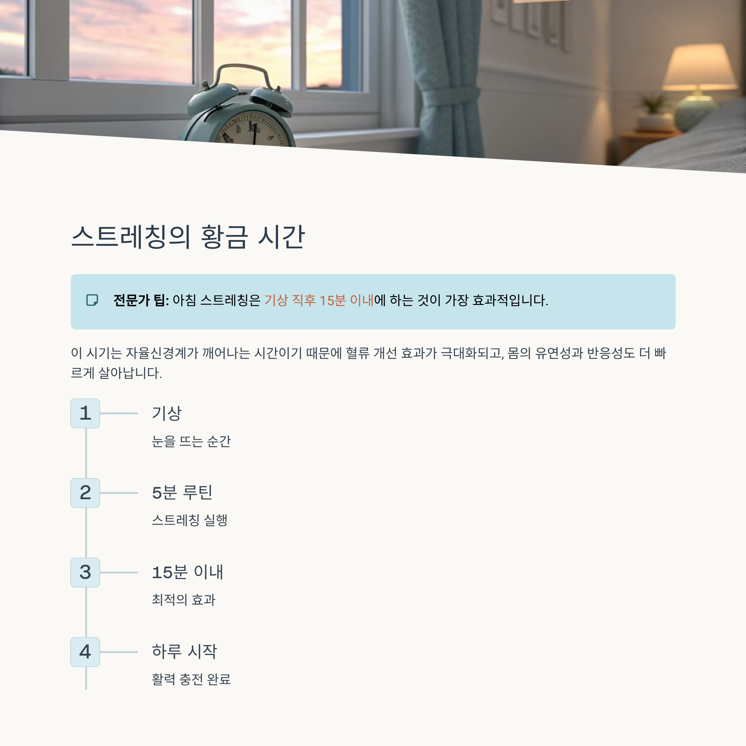 아침 스트레칭은 기상 직후 15분 이내에 하는 것이 가장 효과적입니다.