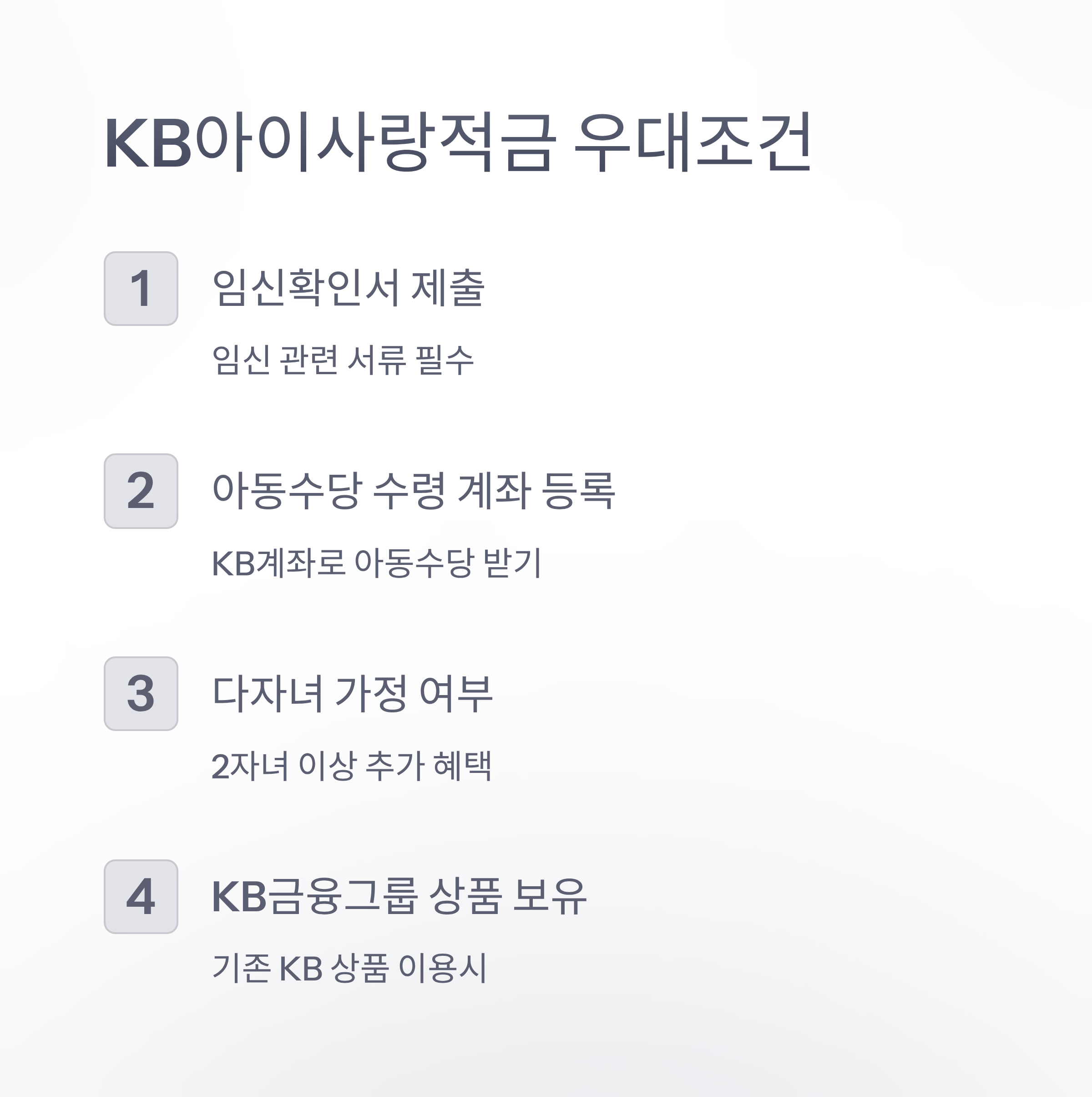 | KB국민은행 | KB아이사랑적금 | 3.0% | 10.0% | 임신확인서, 다자녀, 아동수당 수령 등 |