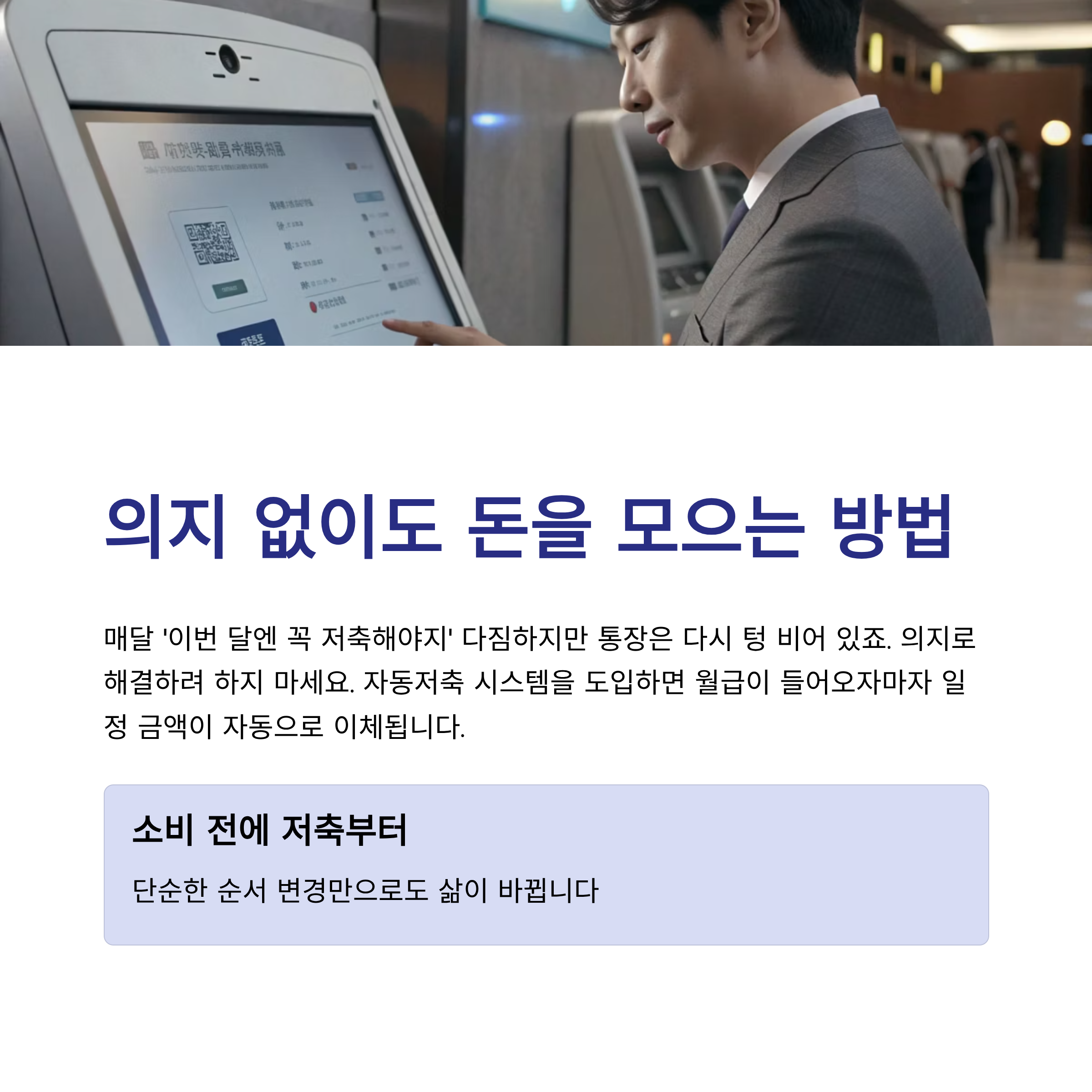 당신이 아무리 강한 의지를 가져도, 매달 반복되는 지출 앞에 흔들릴 수 있습니다. 반면, 시스템은 감정의 영향을 받지 않아요. 자동저축 시스템은 스스로를 믿지 않아도 되게 만들어주는 가장 스마트한 재테크 방식입니다. 저축이 습관이 되는 순간, 돈은 자연스럽게 쌓이기 시작합니다.