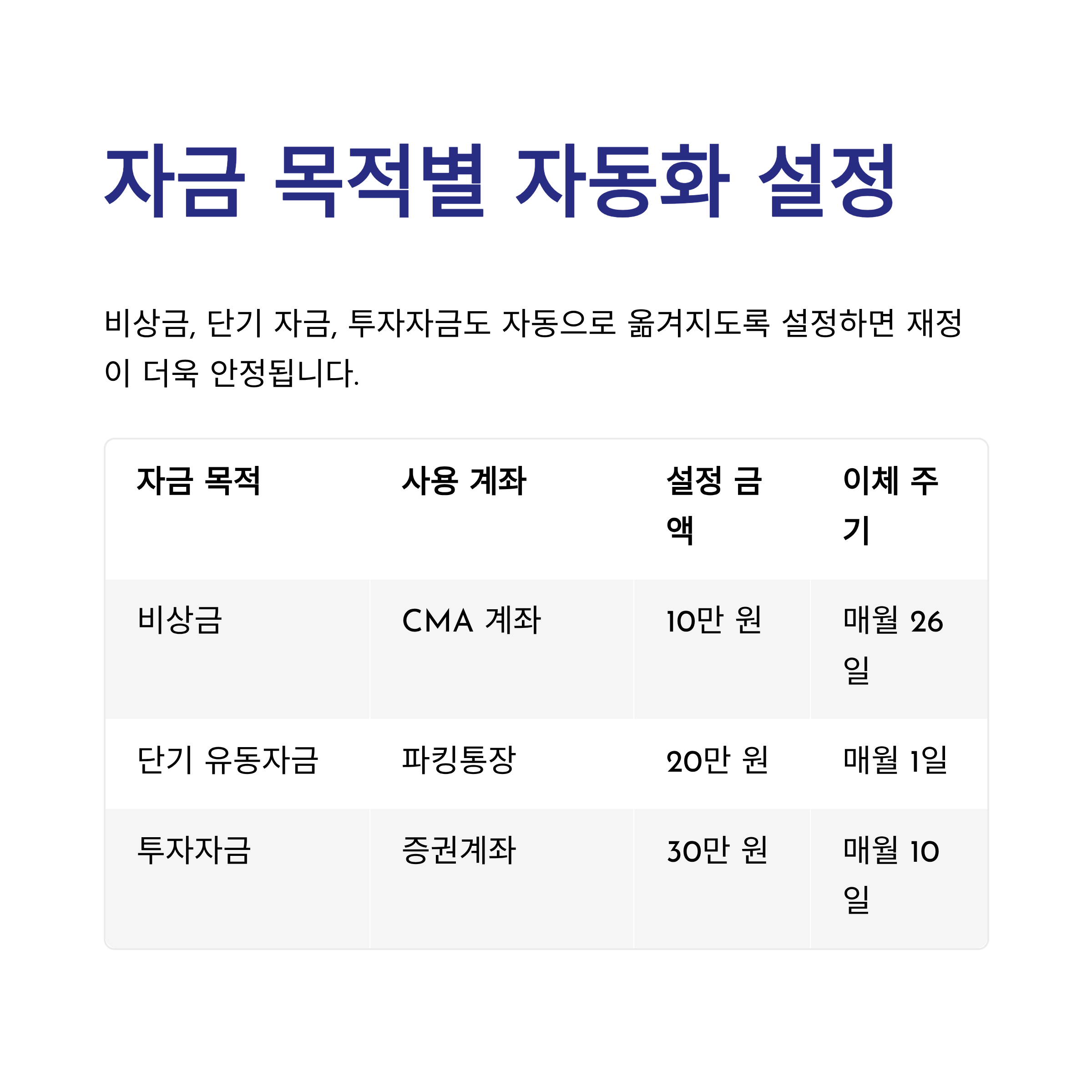 장기 저축뿐 아니라 비상금이나 단기 자금도 자동으로 옮겨지도록 설정해두면 재정이 더욱 안정됩니다. CMA 계좌나 파킹통장을 활용하면 언제든지 꺼내 쓸 수 있으면서도 약간의 이자도 챙길 수 있어요.