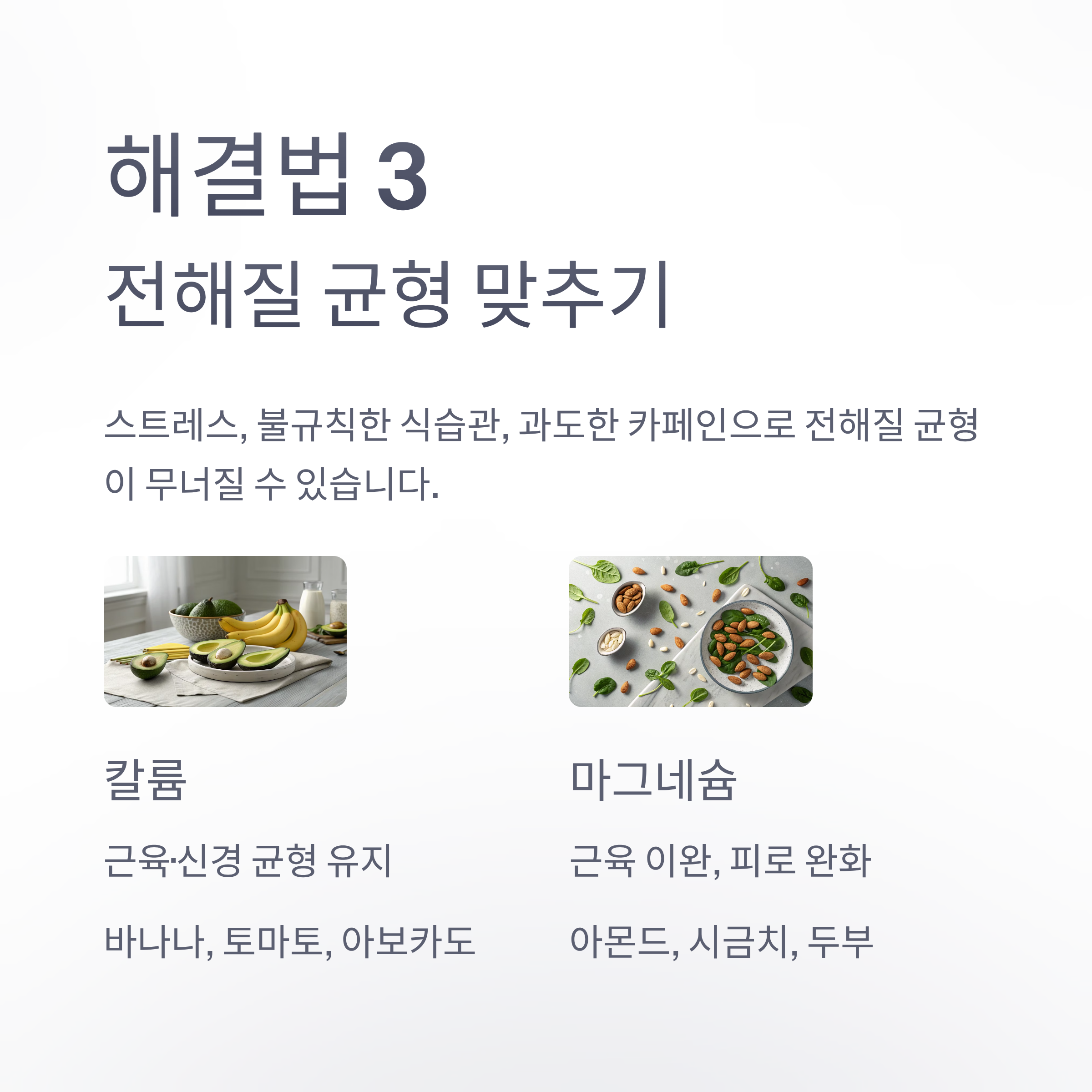 | 마그네슘 | 근육 이완, 피로 완화 | 아몬드, 시금치, 두부 |