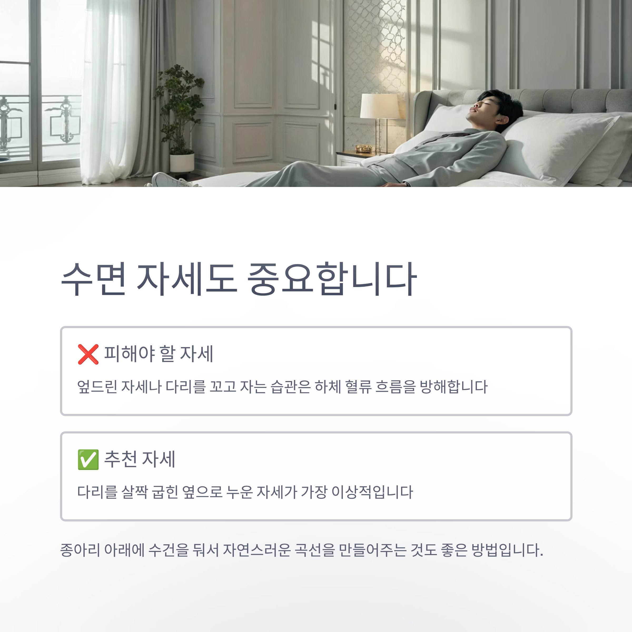 잠자는 자세도 종아리 뭉침에 영향을 줄 수 있습니다.