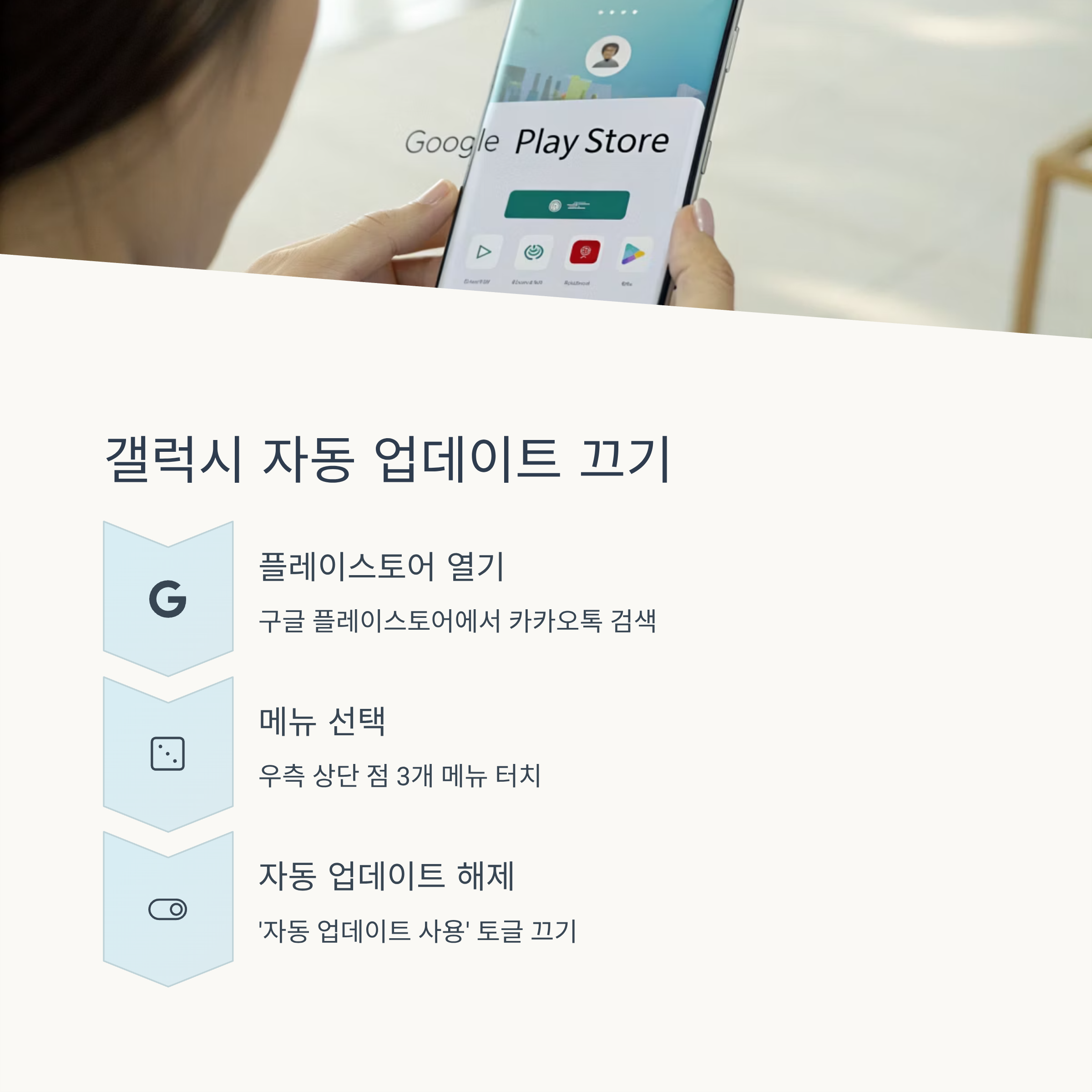 갤럭시 사용자는 구글 플레이스토어에서 카카오톡 앱 페이지를 열고, 우측 상단 점 3개 메뉴에서 ‘자동 업데이트 사용’을 해제하면 됩니다. 모든 앱의 자동 업데이트를 끄고 싶다면, 플레이스토어 설정의 ‘앱 자동 업데이트’를 ‘하지 않음’으로 지정하면 됩니다.
