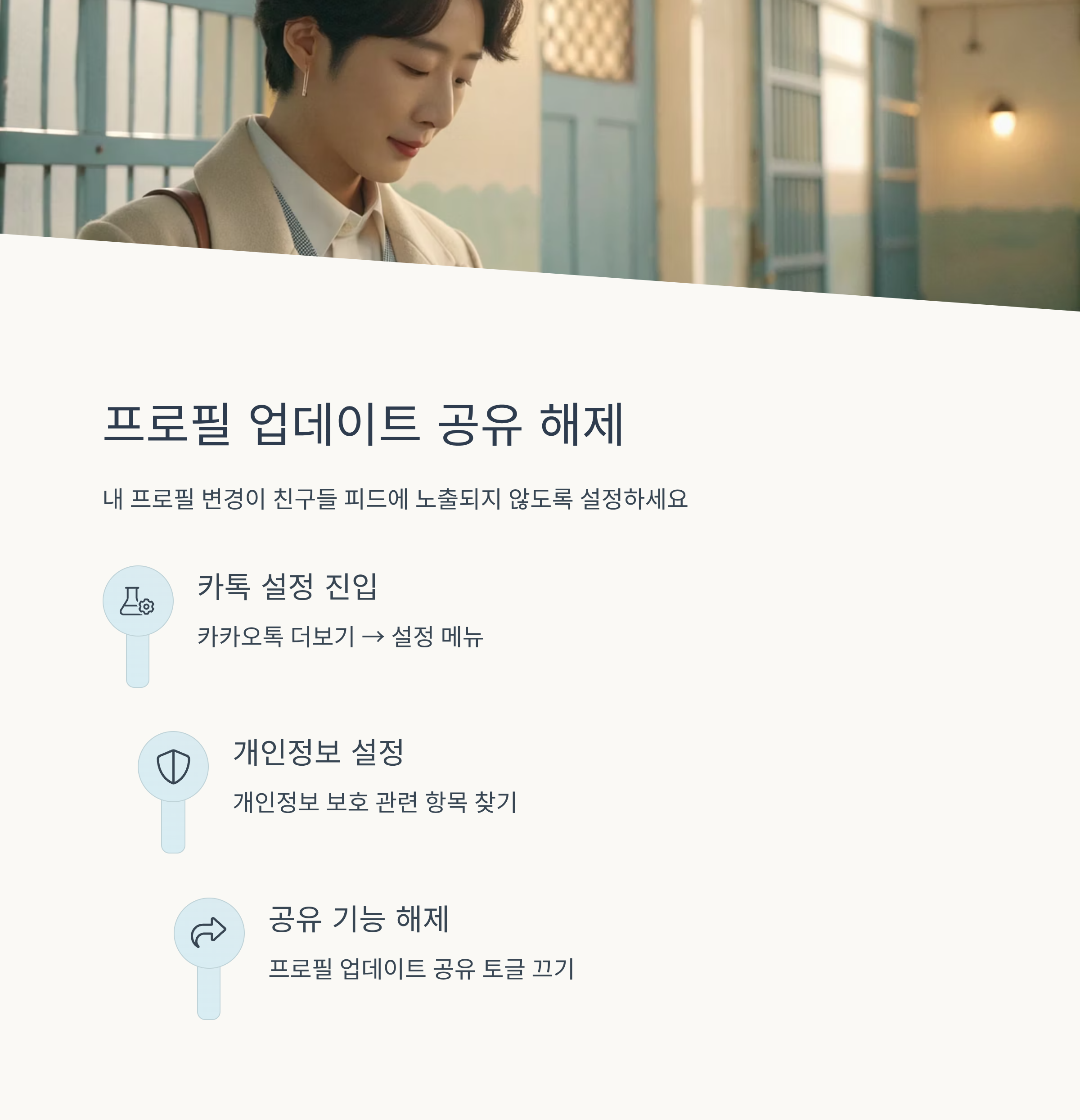 최근 불편의 핵심은 친구 탭에 뜨는 프로필 업데이트 공유입니다. 불필요하게 내 프로필 변경이 피드에 노출되지 않도록 설정에서 공유 항목을 해제할 수 있습니다. 이렇게 하면 최소한의 정보만 노출되고, 불필요한 피드 노출을 줄일 수 있습니다.
