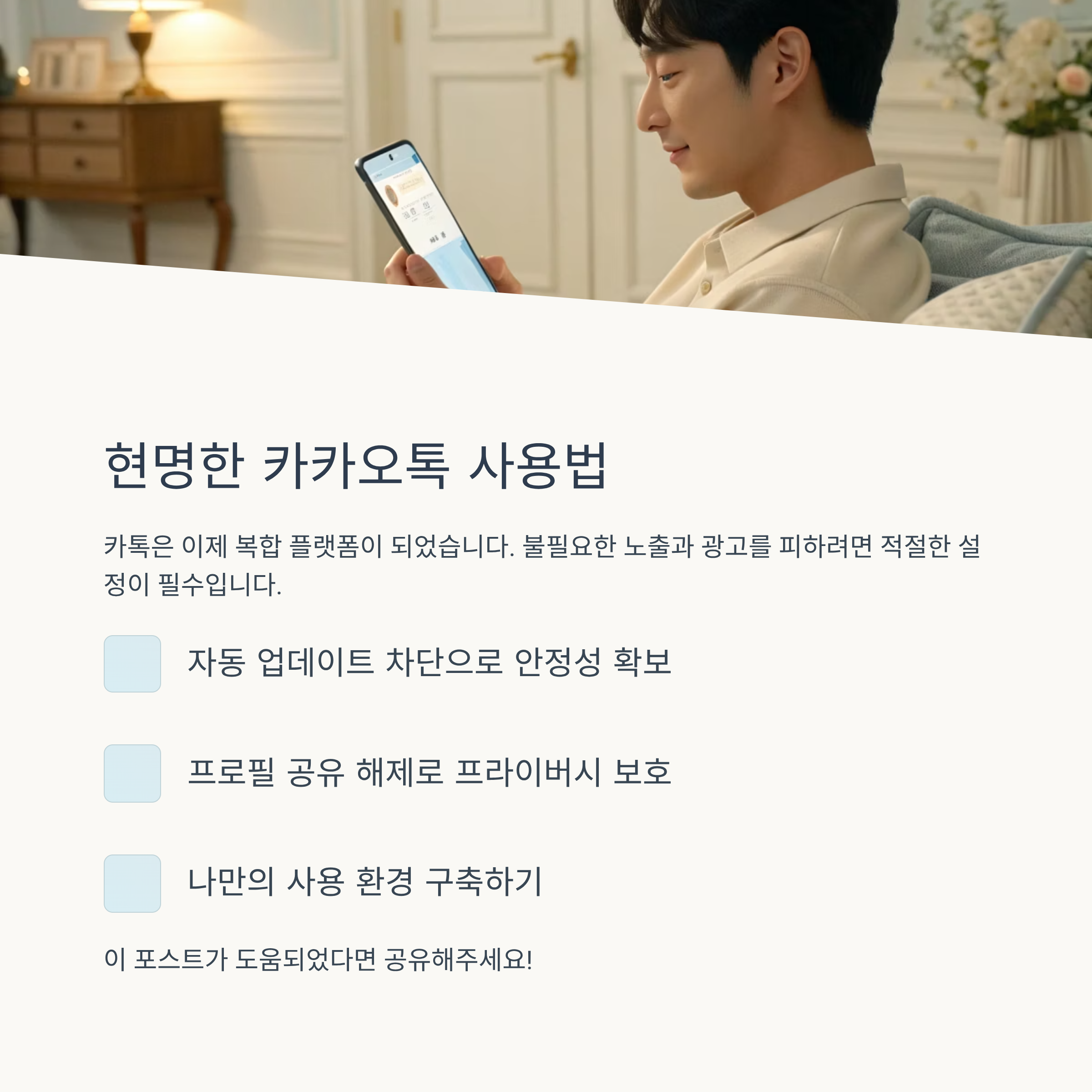 카톡은 이제 단순 메신저가 아닌 복합 플랫폼이 되고 있습니다. 하지만 불필요한 노출과 광고 때문에 불편하다면, 자동 업데이트 차단과 프로필 공유 해제 같은 최소한의 설정으로 나만의 사용 환경을 지키는 것이 중요합니다.