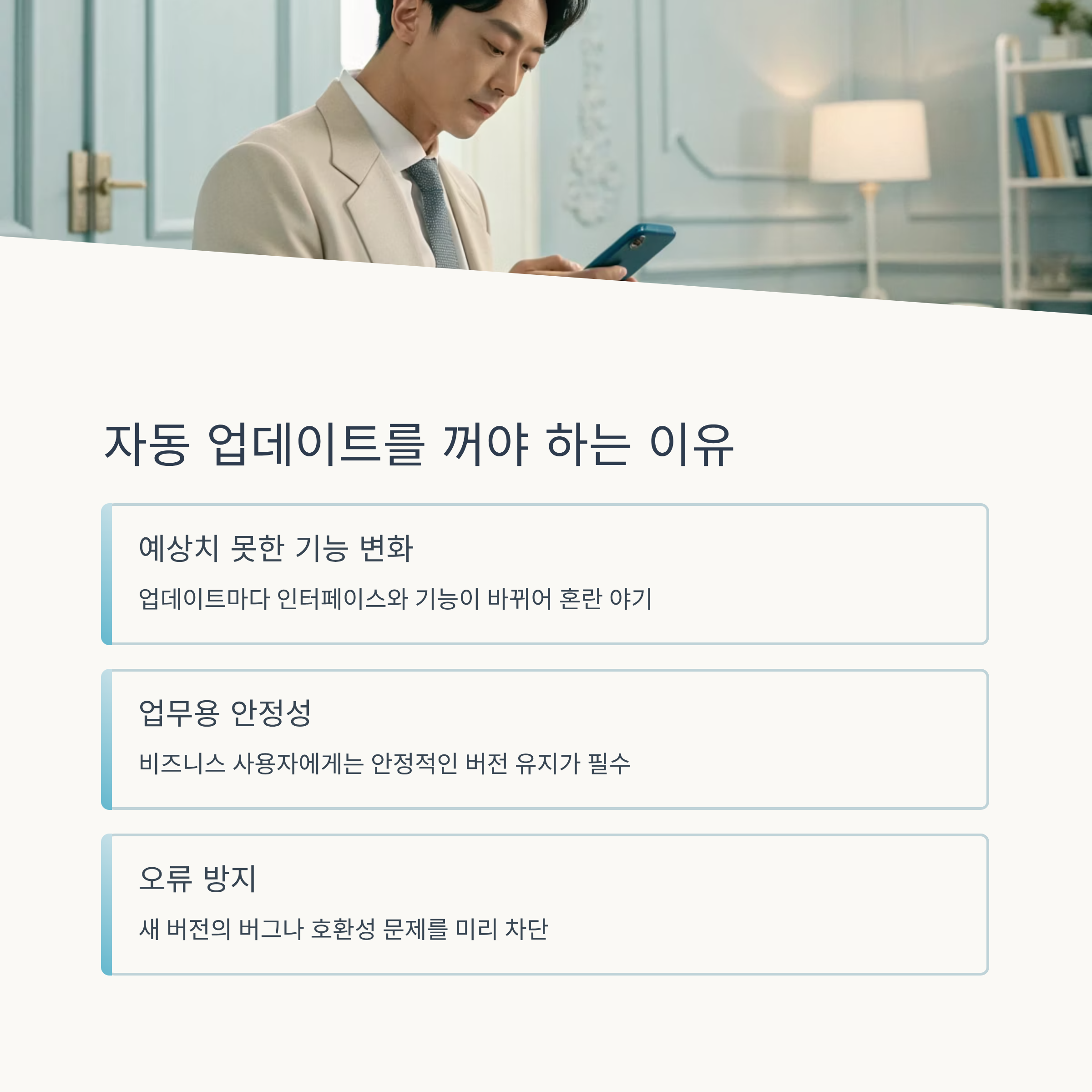 자동 업데이트를 꺼두더라도 업데이트 알림은 받을 수 있습니다. 알림을 통해 보안 패치나 중요 변경 사항만 체크하고, 필요할 때 수동으로 업데이트하면 안정성과 편의성을 동시에 챙길 수 있습니다.