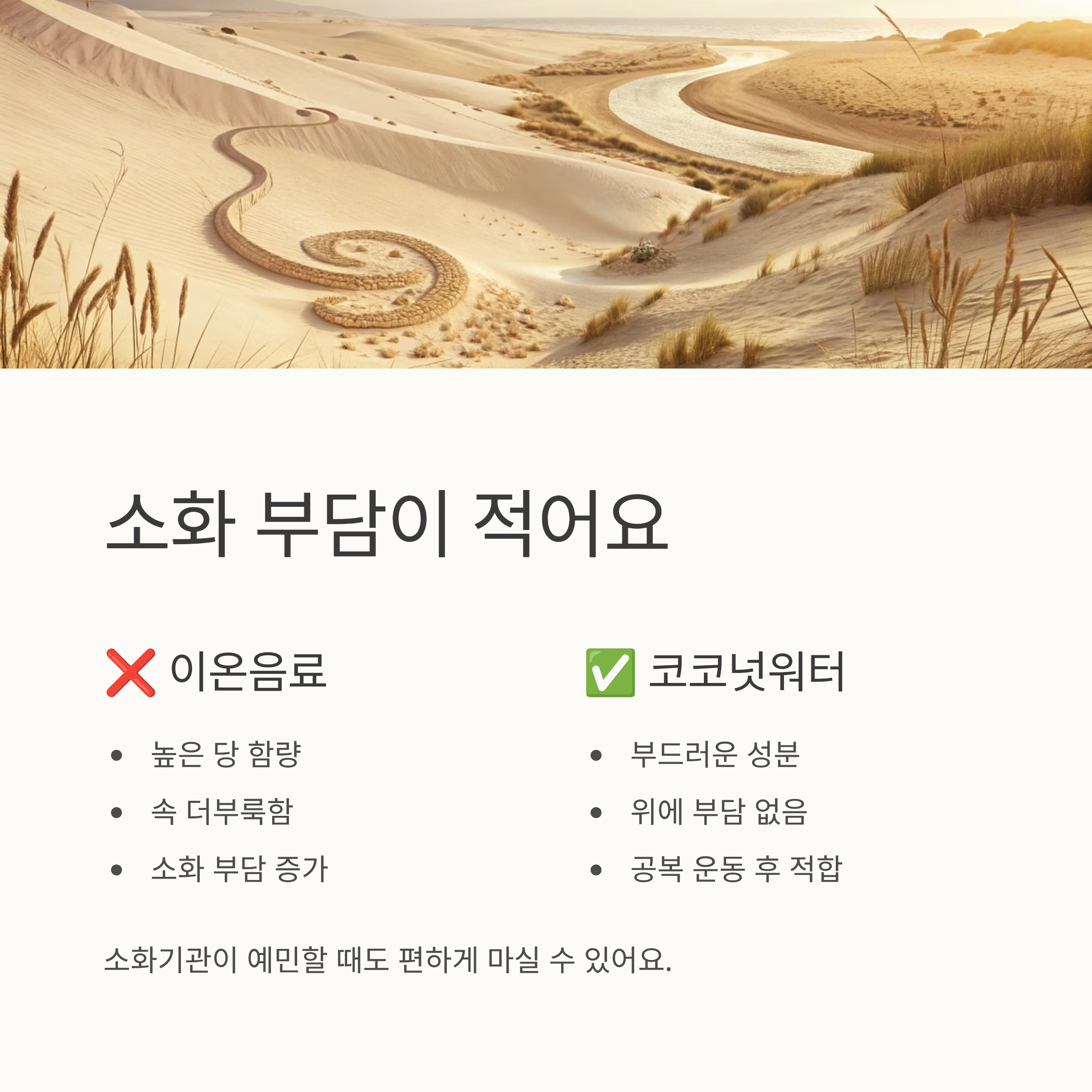 코코넛워터는 위에 부담을 주지 않는 부드러운 성분 구성으로