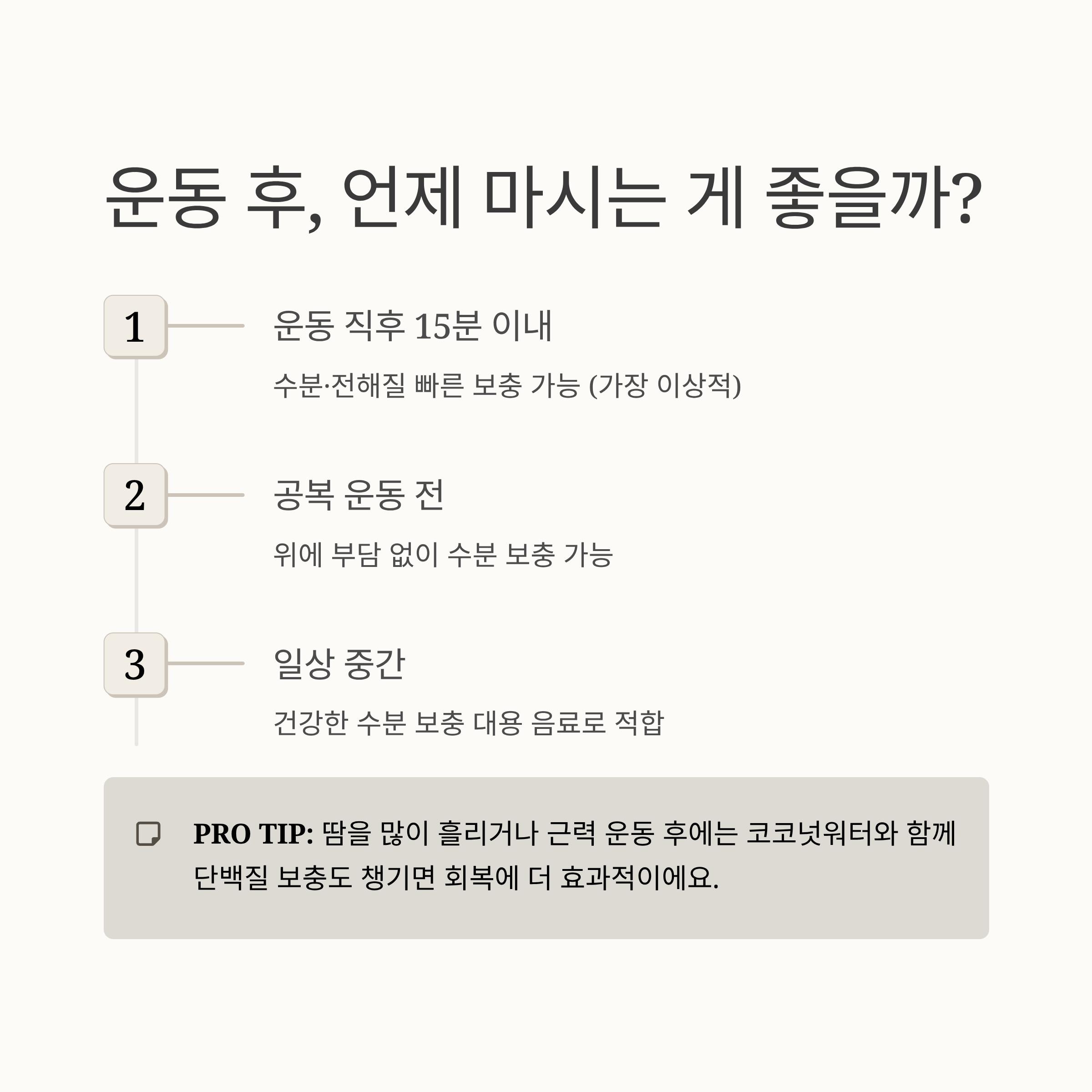 | 운동 직후 | 수분·전해질 빠른 보충 가능 |
