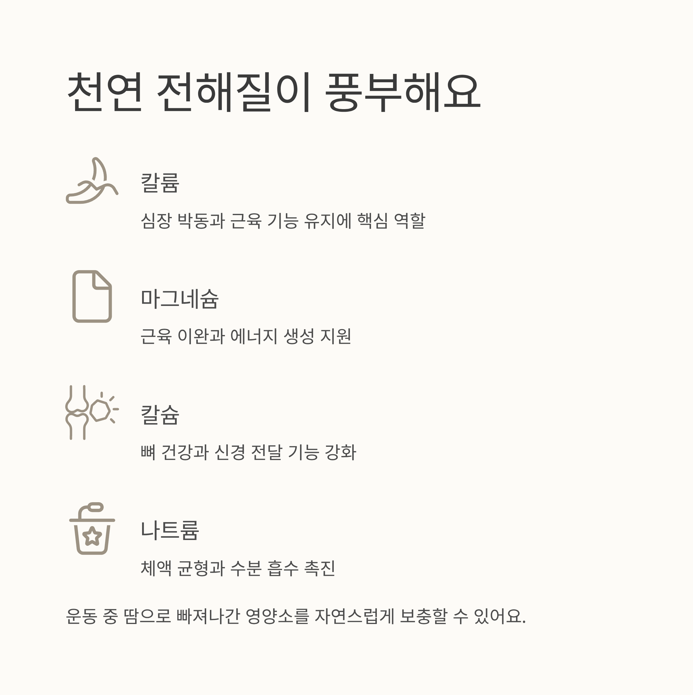 칼륨, 마그네슘, 칼슘, 나트륨 등 전해질을 다양하게 함유하고 있어요.