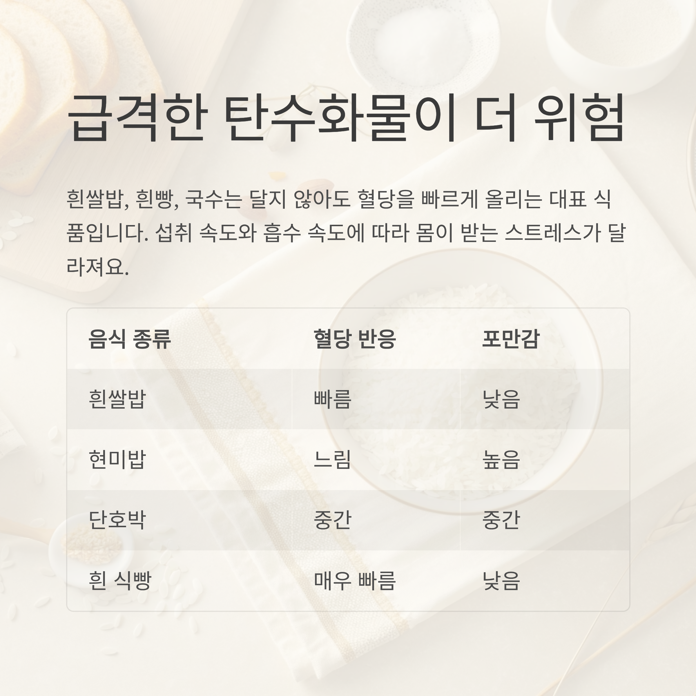 | 음식 종류 | 혈당 반응 속도 | 포만감 유지력 |