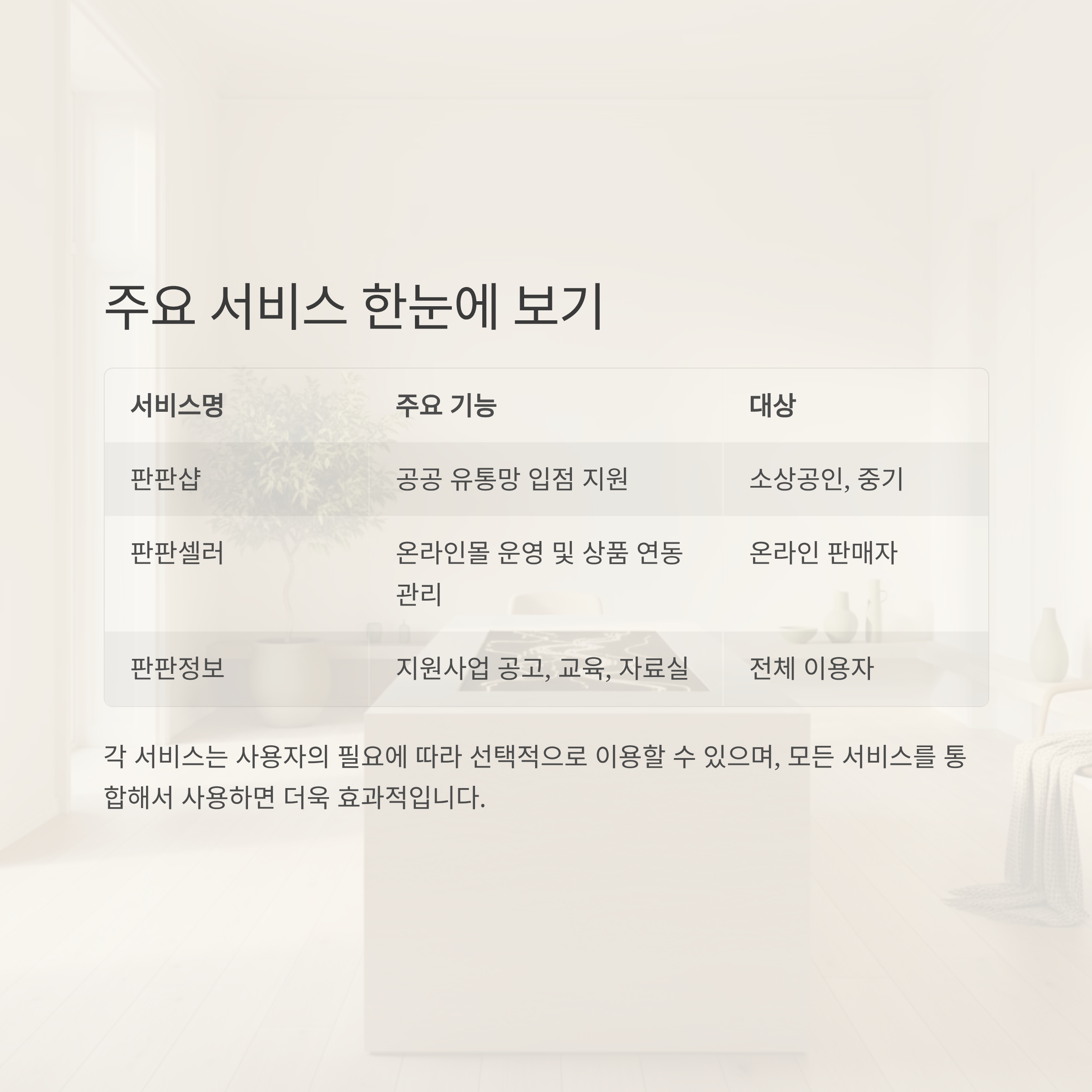 | 판판샵 | 공공 유통망 입점 지원 | 소상공인, 중기 |