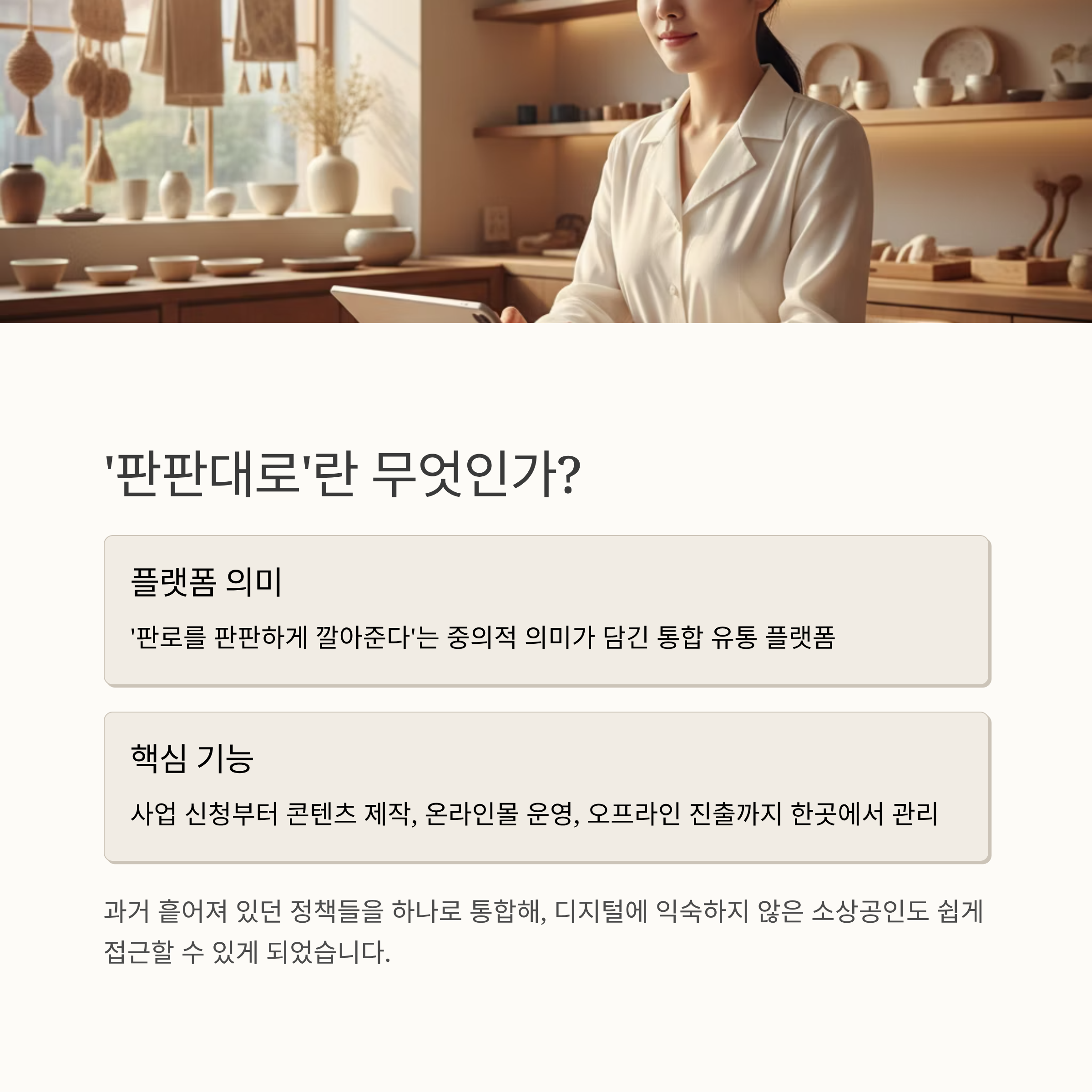 한 플랫폼에서 사업 신청부터 콘텐츠 제작, 온라인몰 운영, 오프라인 진출까지 관리할 수 있는 구조로 만들어졌습니다.