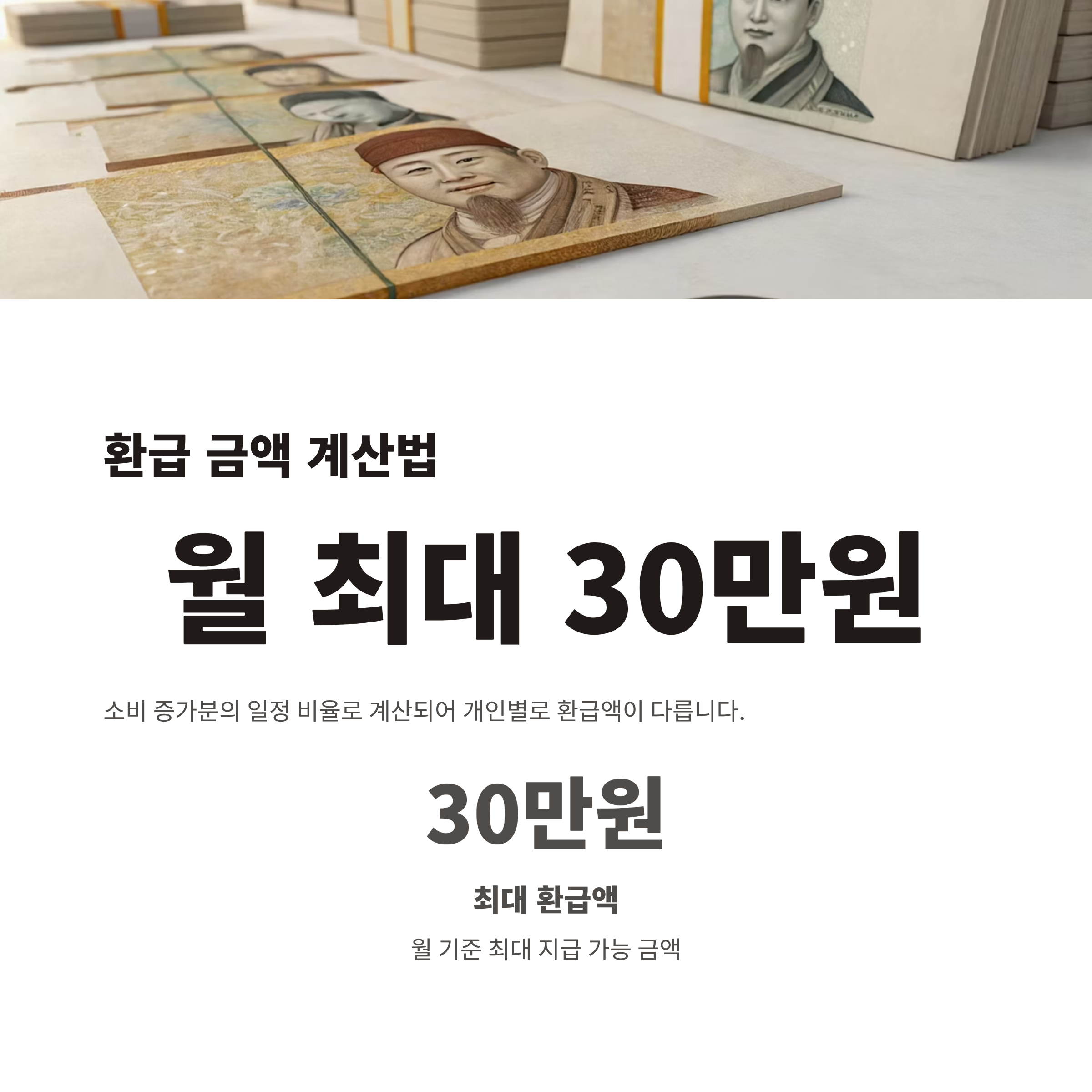 월 최대 30만 원까지 환급받을 수 있으며, 소비 증가분의 일정 비율을 계산해 환급 금액이 정해집니다. 단순히 사용 금액이 아니라 "평균 소비 대비 추가 사용분"이 기준이 되기 때문에 환급액은 개인별로 다릅니다.