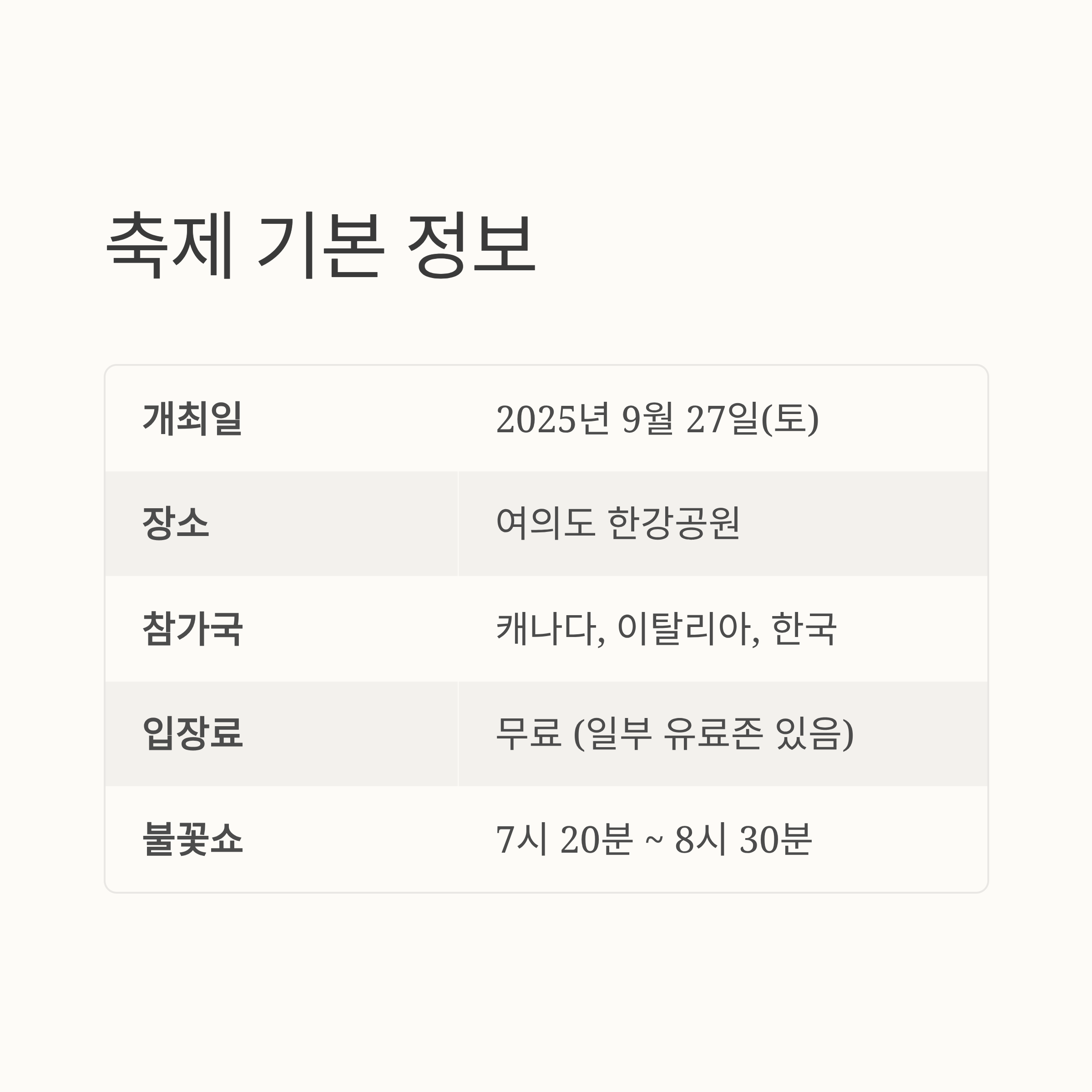 2025년 서울세계불꽃축제가 9월 27일 토요일, 여의도 한강공원 일대에서 열립니다. 오후 1시부터 시작되는 시민참여 프로그램부터 저녁 7시 20분부터 본격적으로 펼쳐지는 불꽃쇼까지! 관람 꿀팁과 명당, 교통정보를 미리 체크해두면 한층 더 편하고 즐겁게 즐길 수 있답니다.