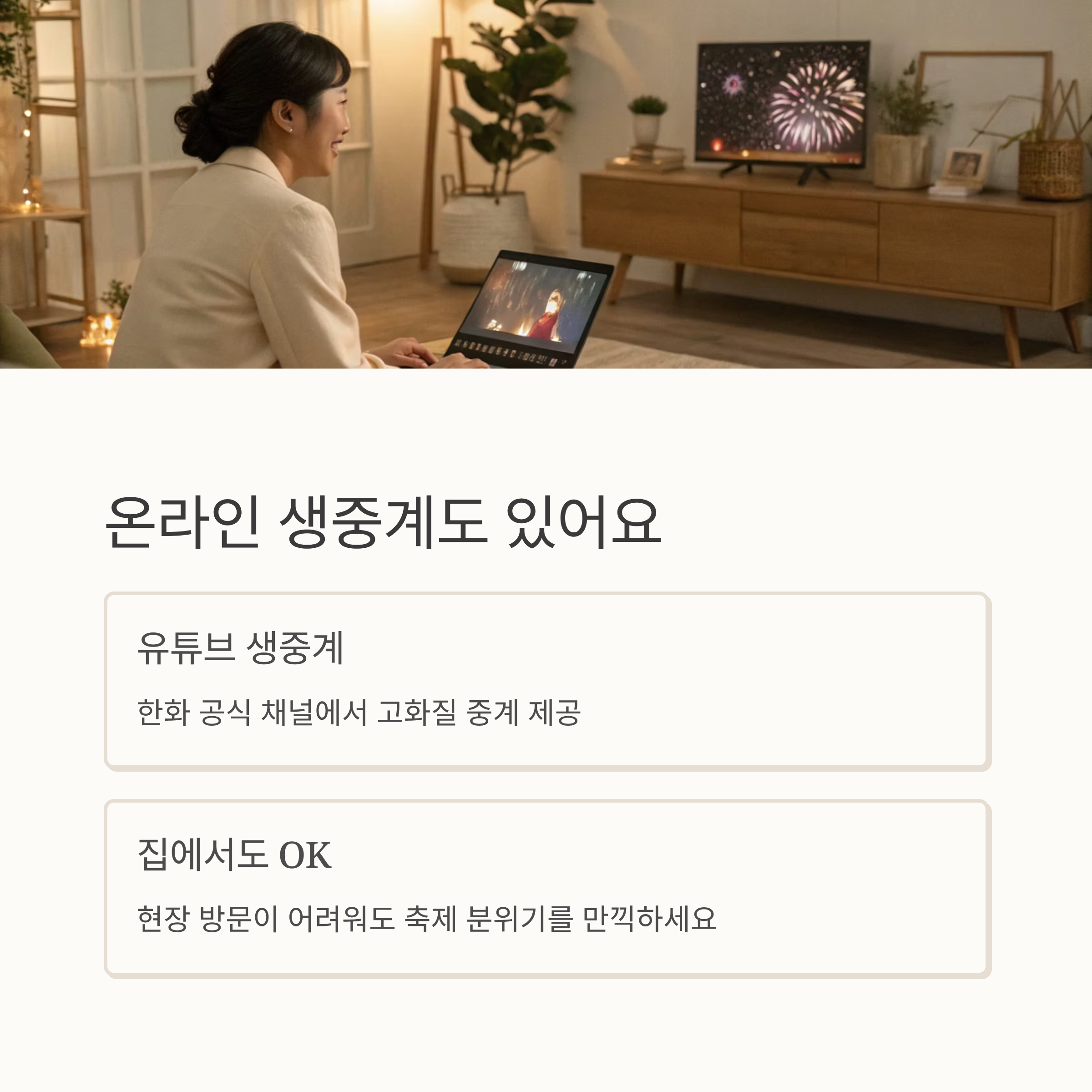한화 공식 채널 등에서 고화질 중계가 제공되며, 집에서도 충분히 축제 분위기를 느낄 수 있답니다.