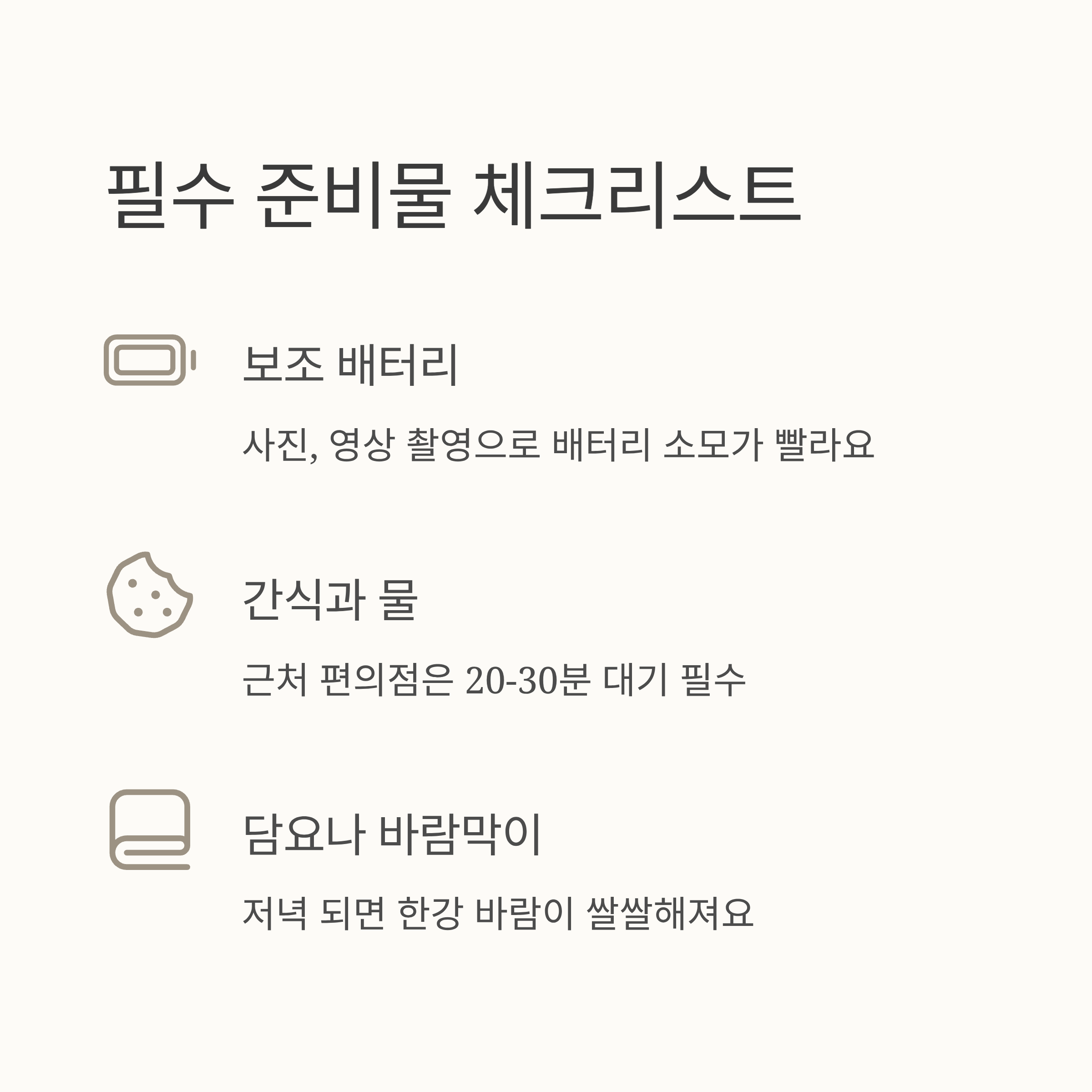 많은 분들이 돗자리는 기본으로 챙기시지만, 다음 3가지는 놓치고 오시는 경우가 많아요.