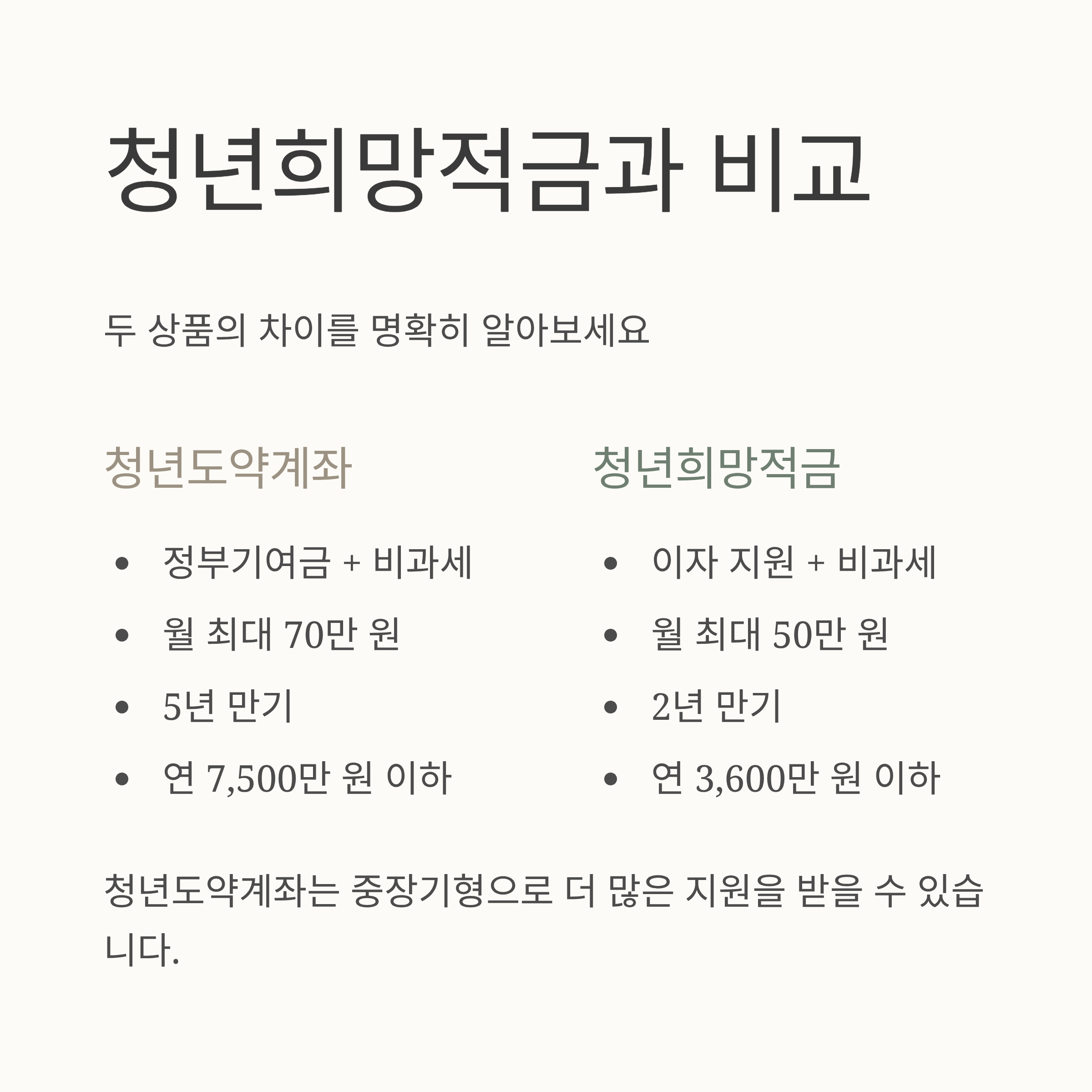 | 지원 방식 | 정부기여금 + 비과세 | 이자 지원 + 비과세 |